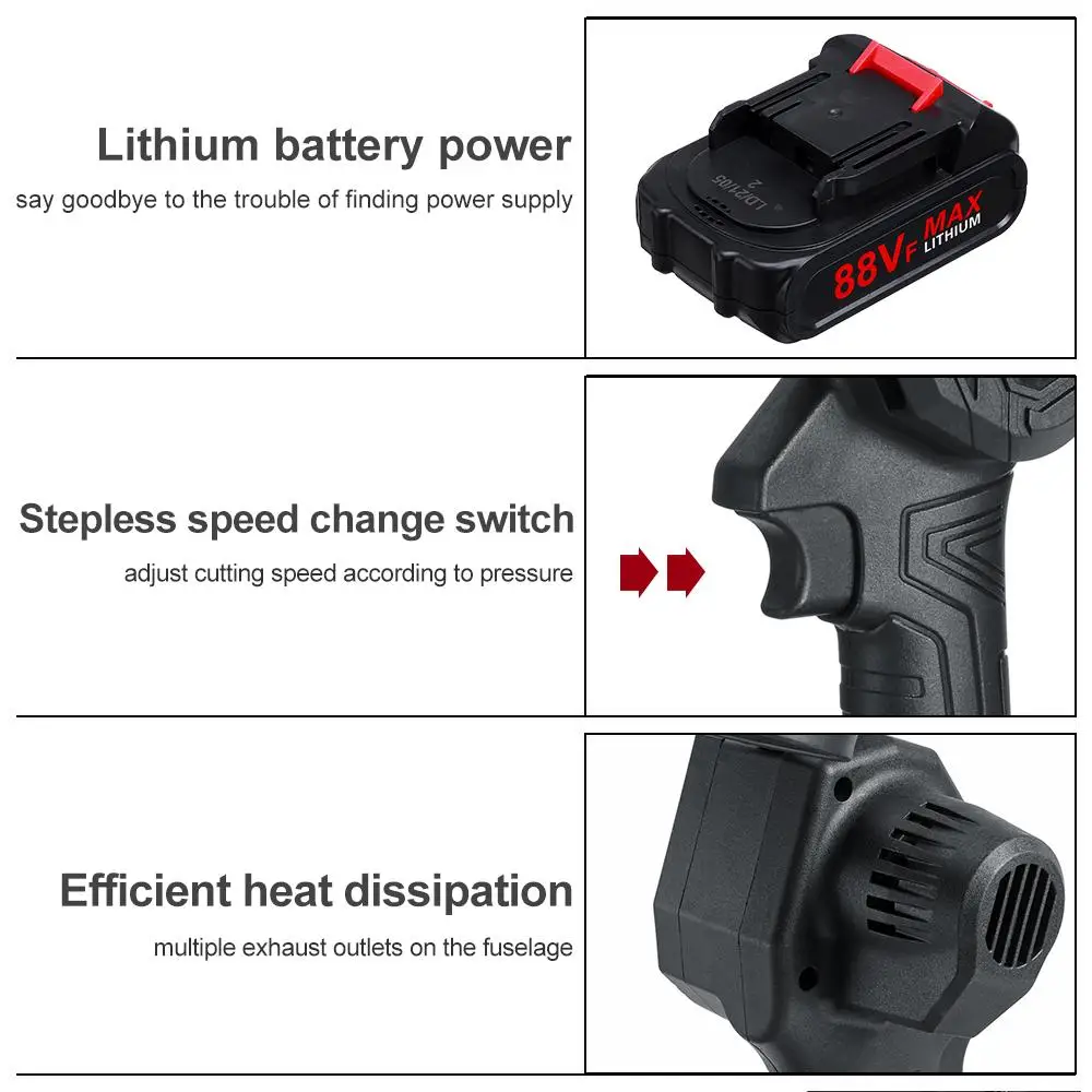 Особенности товара:Цвет: черныйНапряжение: 88 вМощность: 3000 ВтМатериал: АБС + стальДлина направляющей пластины: 4 дюймаСкорость цепи: 5 м/сЦепь: быстрая регулировкаБыстрая зарядка: 1,5 (3) часСкорость вращения: 10000р/минЕмкость аккумулятора: 10000 мАчКоличество аккумуляторов: 1/2Режущий Диаметр: 100 мм/3,9 ВРазмер корпуса: 12x33 см/4,7x13 дюймов