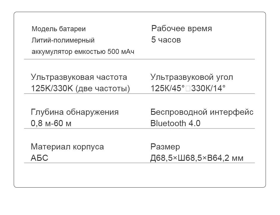 XA02 Поддержка Русский язык. Сонар и радиЧастота гидролокатора: 125 кГцУгол луча гидролокатора: 90 градусовРадиочастота: 2,4GРабочая температура: -10 ~ 60 ℃2. Источник питания:Батарея: литиевая батарея 3,7 вВремя работы: 20 ч (полная батарея)