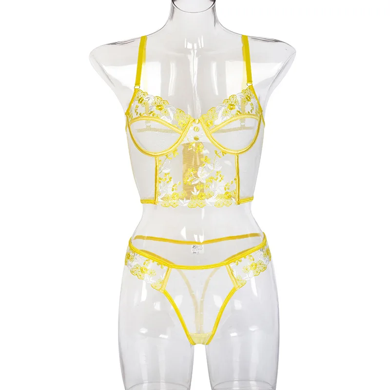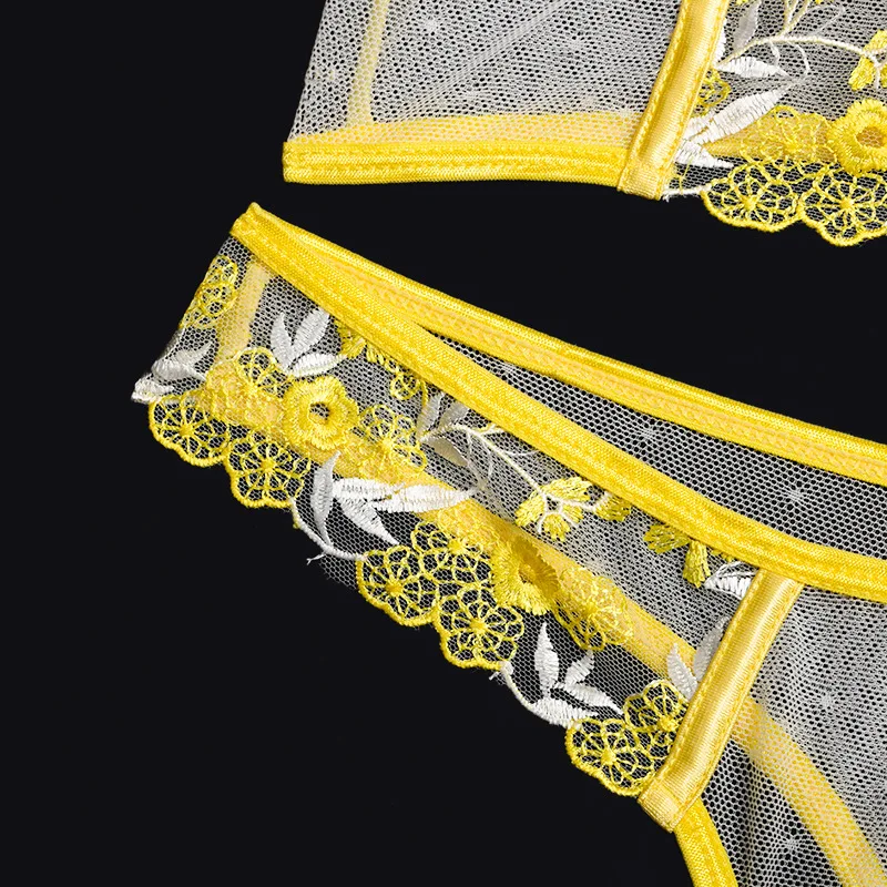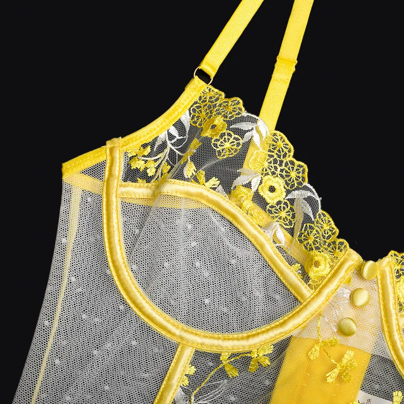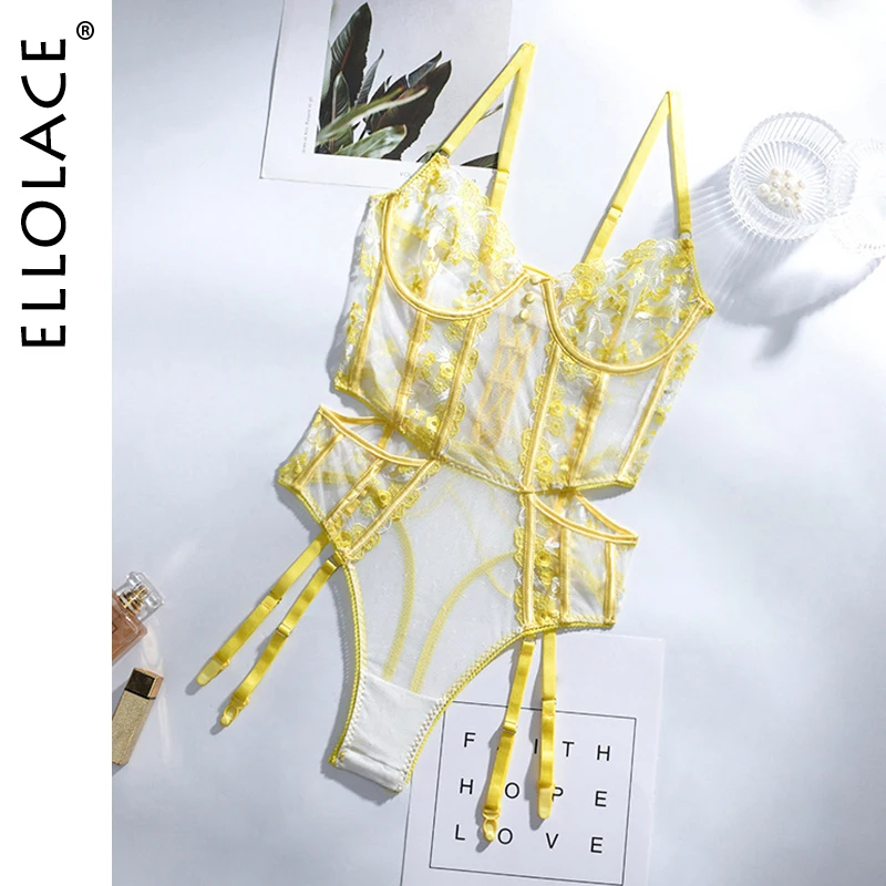 Боди Ellolace, кружевное, с цветочной вышивкой, прозрачное, желтое