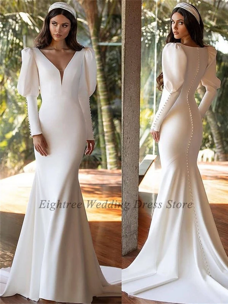 Женское атласное свадебное платье-русалка, с V-образным вырезом и длинными рукавами-фонариками