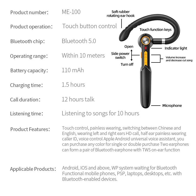 5. Эргономичный дизайн: ушные крючки Bluetooth вращаются на 280 °, подходят для ношения на левом и правом ушах.