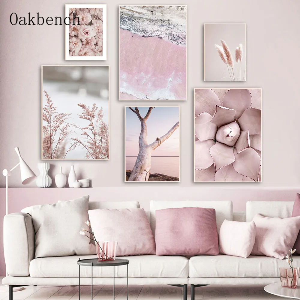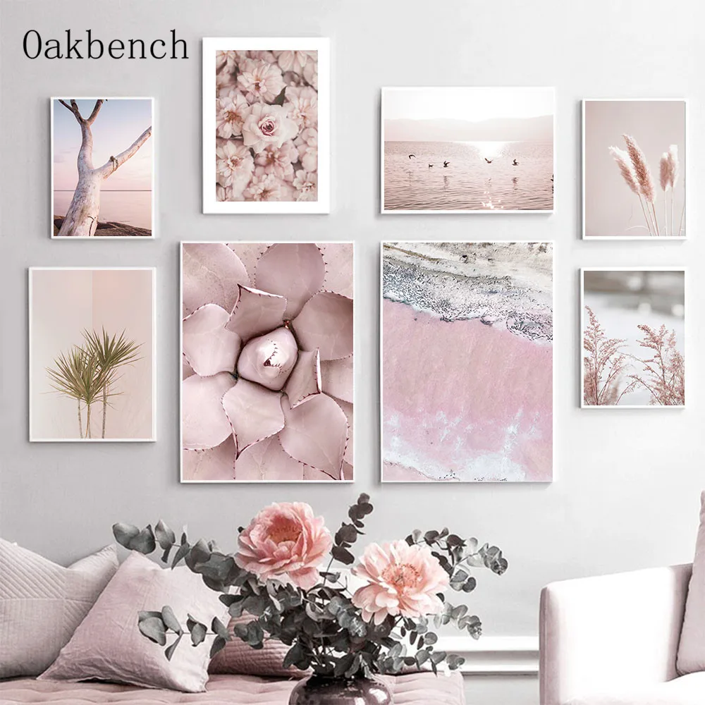 Настенные постеры с розовыми цветами, Настенная картина С закатом, пляжный холщовый постер с рисунком растений, язычков, скандинавские картины для украшения гостиной