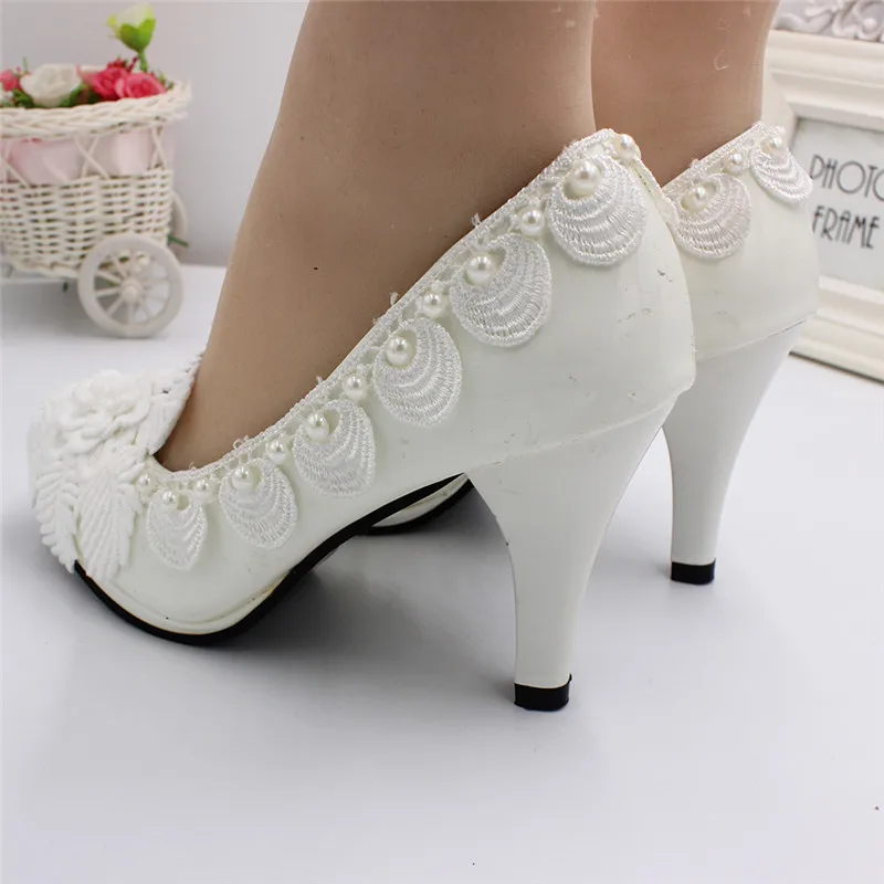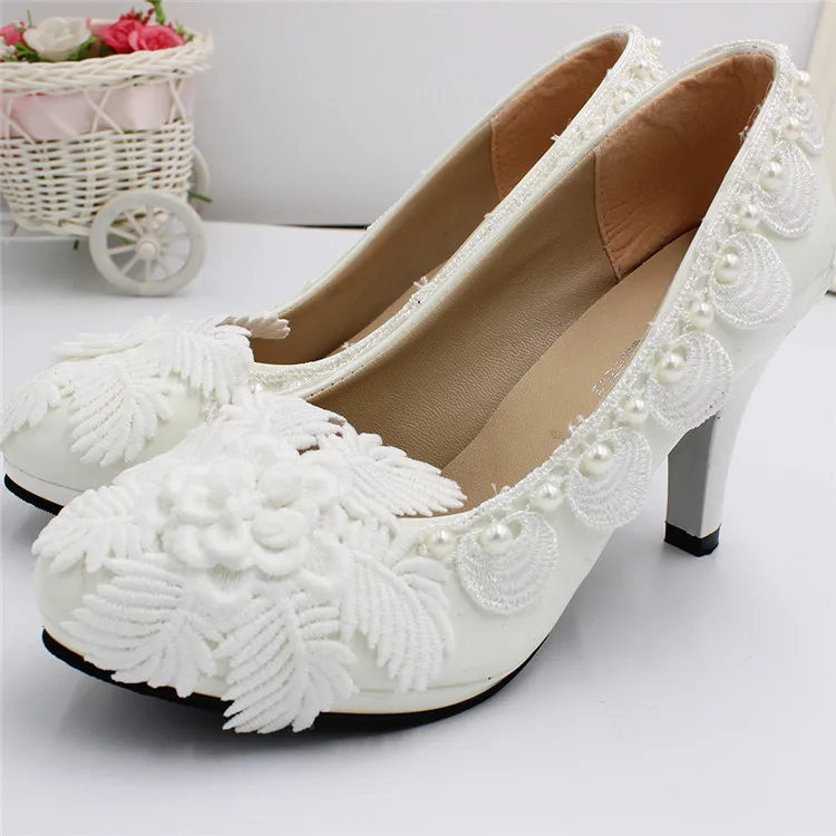 Туфли женские свадебные на высоком каблуке, кружевные, с жемчугом, свадебные туфли, высокий каблук, белые, цвета слоновой кости
