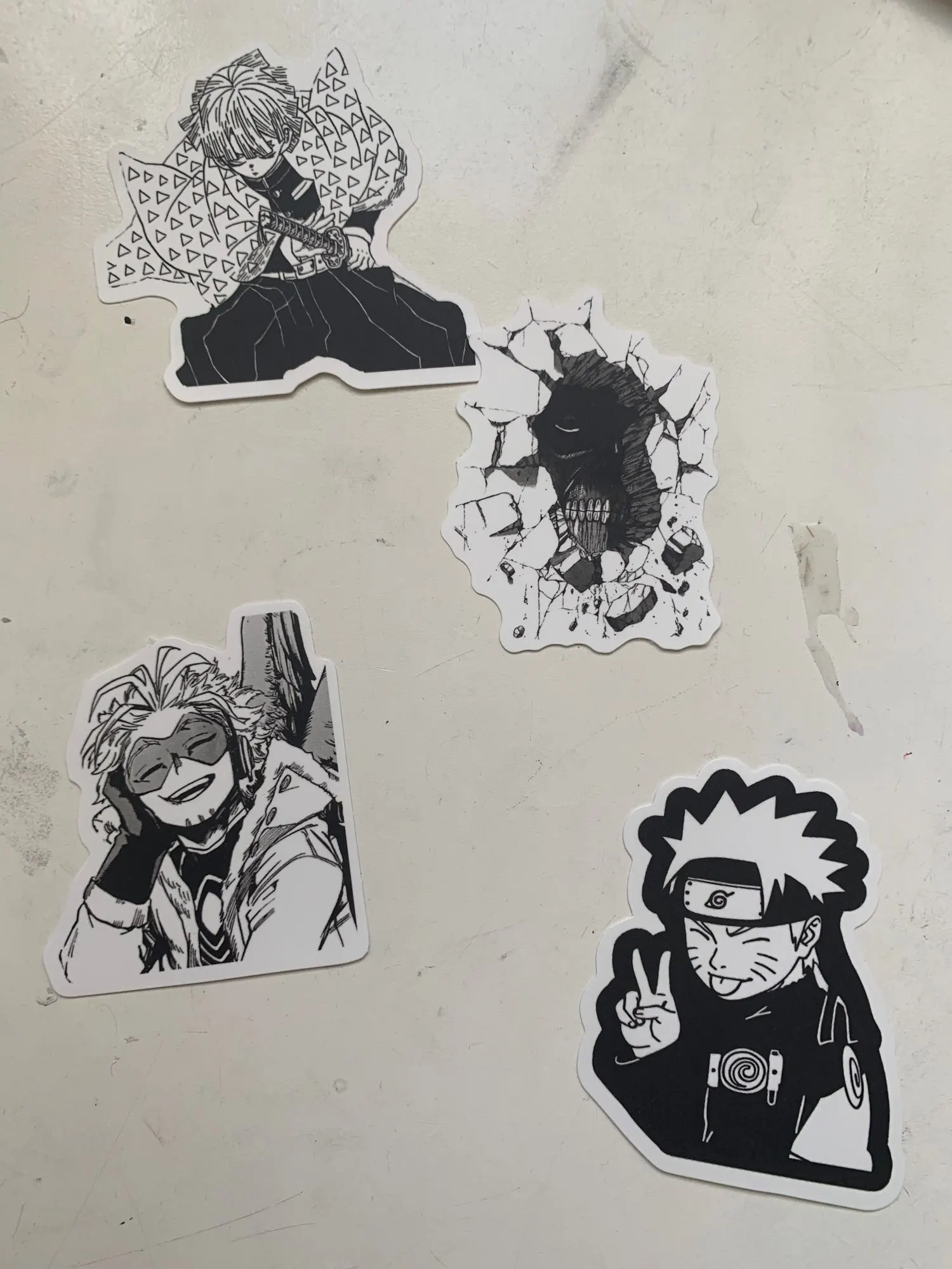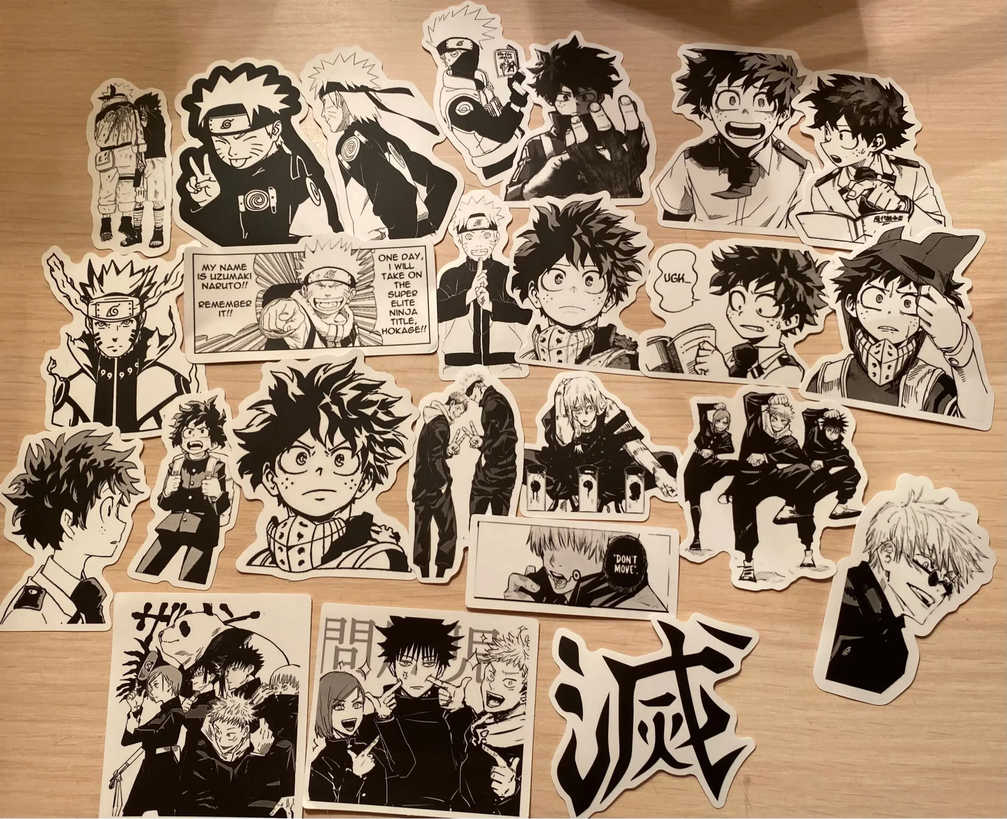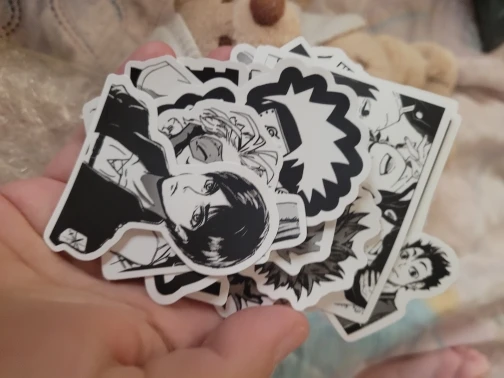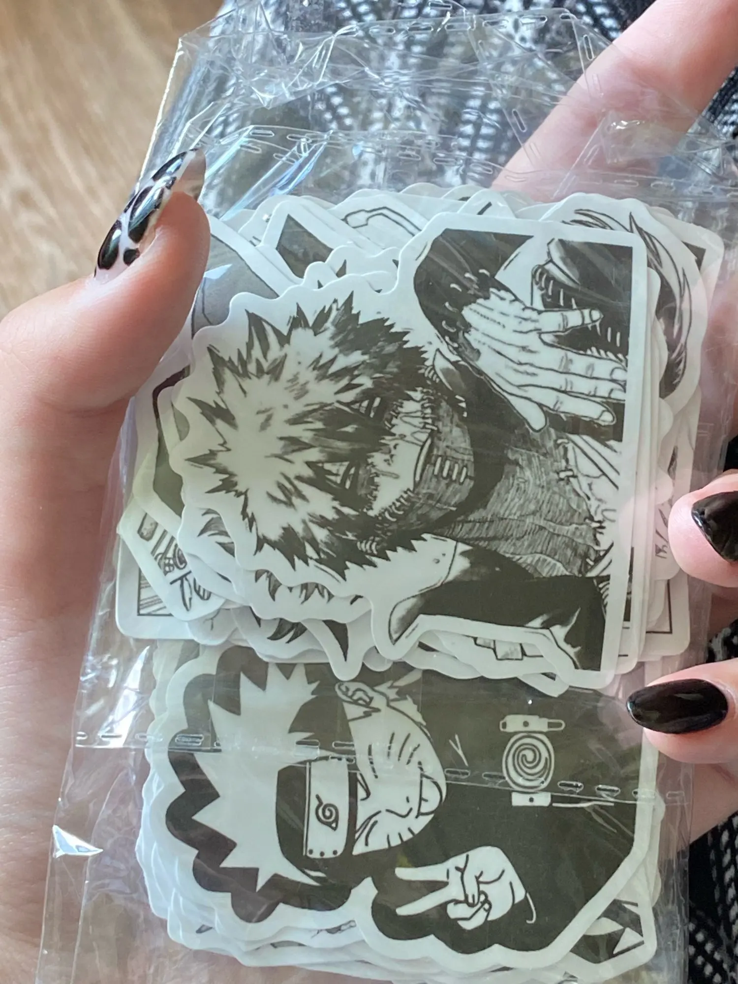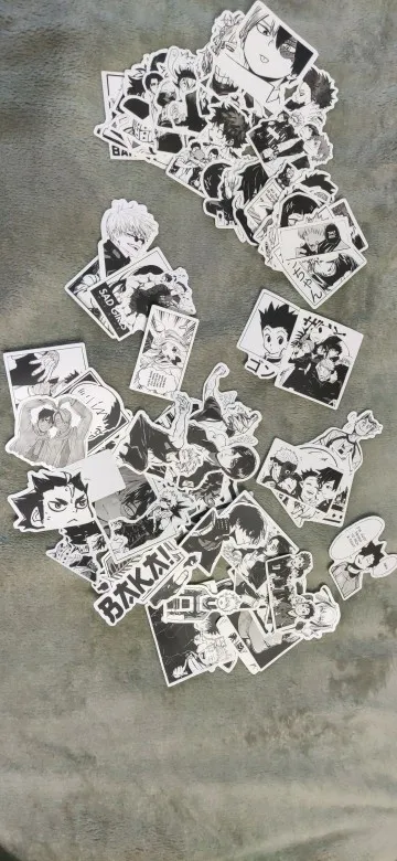 Прекрасные стикеры Я заказывала 100 штук и одинаковых не нашла качество печати отличное и они матовые Мне в основном попались с Геройской академия и Магической битвы В меньшем количестве Безумный азарт и Наруто И ещё по пару штук с Волейбола , Клинка , Гуля ,Атаки титанов Ну и с других аниме но их единицы В общем рекомендую