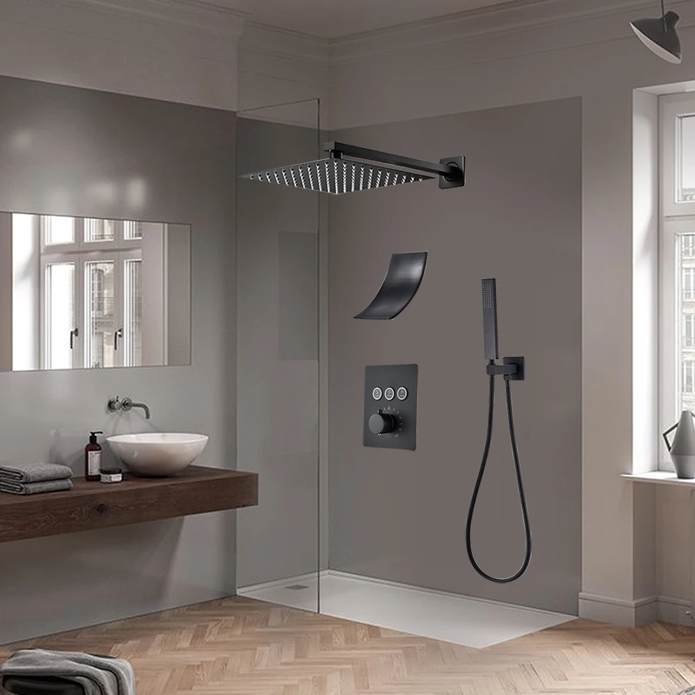 Новый матовый черный Термостатический смеситель для душа в ванную комнату, Душевая система Водопад, смеситель, настенный кран с кнопками