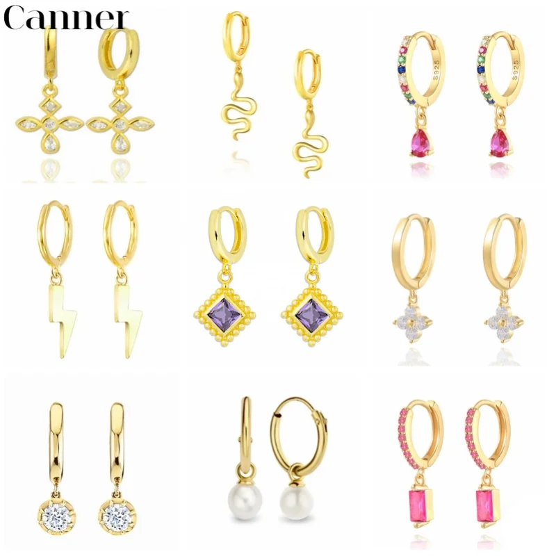 CANNER 2021 Настоящее Серебро S925 Висячие серьги-кольца для женщин жемчужные красочные циркониевые животные очаровательные маленькие серьги-кольца