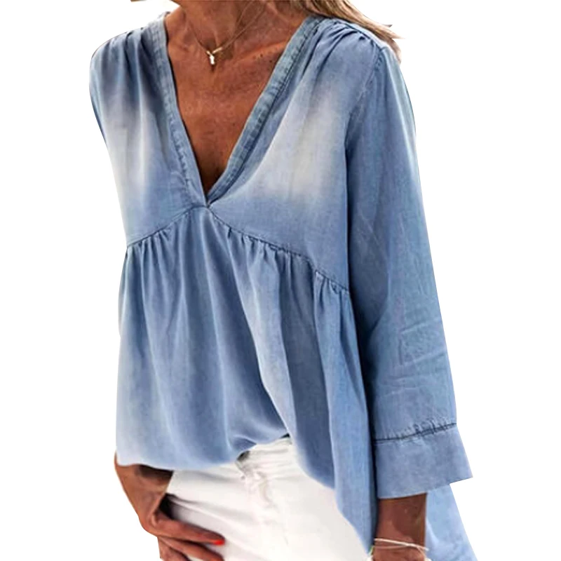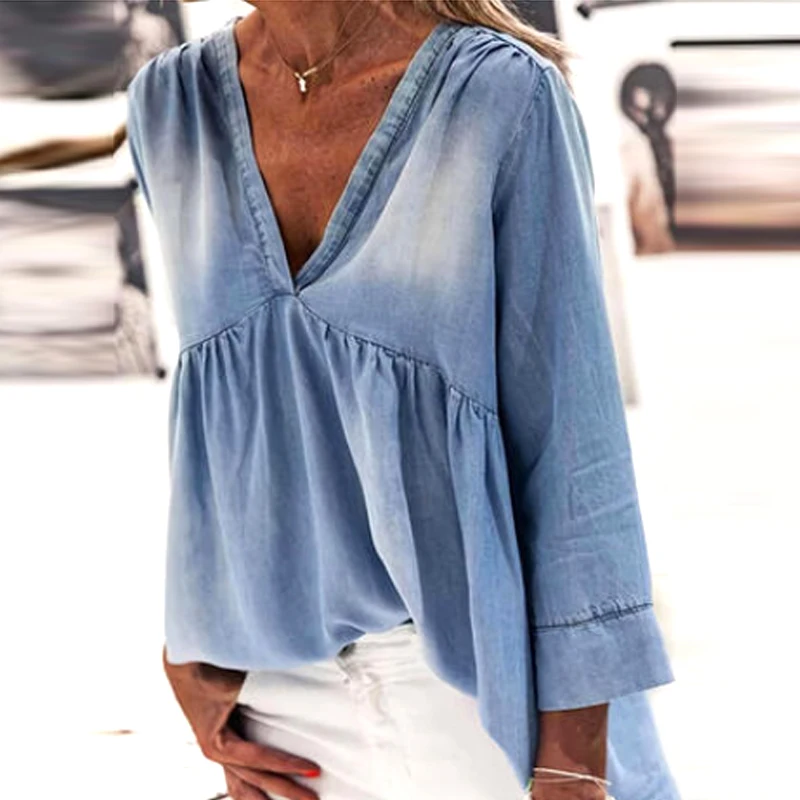 Женский джинсовый топ 2021, летнее синее свободное Повседневное платье в стиле ретро, женская синяя рубашка оверсайз в стиле ретро, Сексуальная футболка с V-образным вырезом для осени