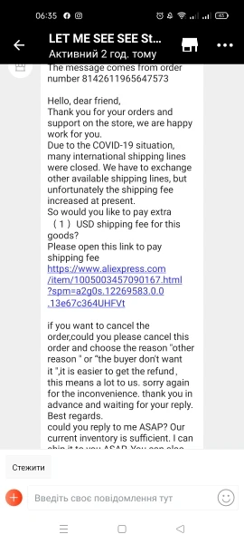 Товар не отримав. Алі повернув гроші. Продавець наглий- після оплати замовлення прислав смс - чи не можу я йому ще 1$ за доставку додатково оплатити, бо мовляв коронавірус, проблеми з доставкою. Хоча на сайті доставка безкоштовна. Я його послав- як виявляється правильно зробив.