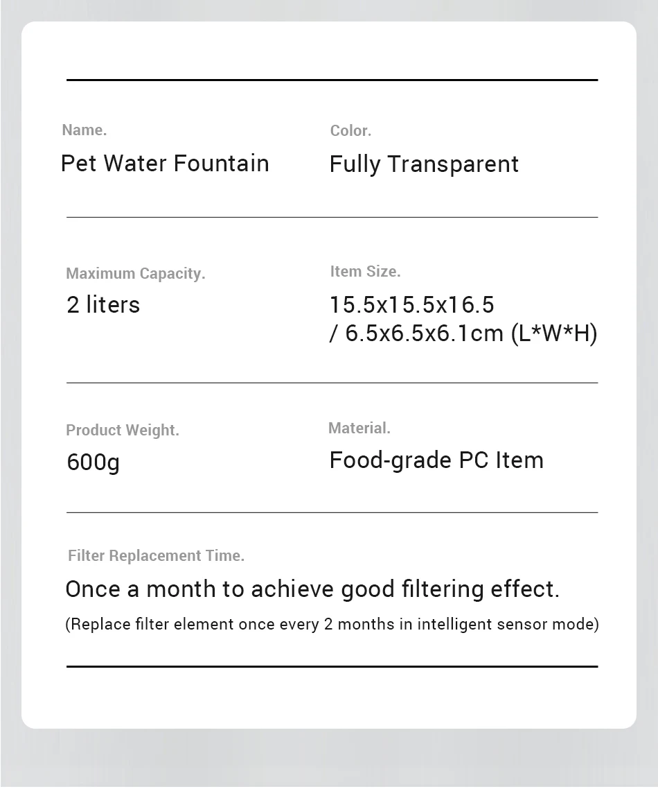 Автоматический фонтан для кошек с краном, угольный фильтр, USB-поилка для кошек, дозатор для воды для собак, датчик движения домашних животных питьевой фонтан для кошекЧистая водаУникальный сменный дизайнерский фильтр эффективно фильтрует волосы, запах и хлор. Следовательно, фонтан дает домашним животным чистую воду и снижает риск развития заболеваний. Угольный фильтр помогает удалить запахи и неприятный вкус.Дизайнерский насосБесшумный насос уникальной конструкции оснащен специальной присоской для снижения уровня шума до минимума.Высокое качествоФонтан для домашних животных изготовлен из пищевого поликарбоната, экологически чистый, нетоксичный, без запаха и прочный. Простая БЫСТРОРАЗЪЕМНАЯ конструкция предназначена для легкого снятия и очистки.Емкость 2 лНет необходимости часто наполнять воду, может удовлетворить питьевые потребности кошек, собак, птиц и других домашних животных различных размеров. Не нужно беспокоиться о том, что ваши питомцы не получат свежего напитка, когда вы на работе.2 режима потока воды (режим крана/режим фонтана), обеспечивающие чистую проточную воду, делают ваших питомцев счастливее и здоровее.ВизуальныйПолностью прозрачный дизайн. Питание от USB-кабеля. Безопасная, Гигиеничная, удобная посудомоечная машина с верхней полкой.Спецификация продукта:Материал: пищевой ПКЦвет изделия: полностью прозрачный (Позвольте вашим питомцам хорошо видеть воду)Максимальная емкость: 2 литра (67 унций)Размер изделия: прибл. 15.5x15.5x16.5 см/6,1x6,1x6,5 дюйма (Д * Ш * В)Вес продукта: 600 гВремя замены фильтра:1. Угольный фильтр лучше менять каждый месяц, чтобы добиться хорошего фильтрующего эффекта.2. В интеллектуальном сенсорном режиме угольный фильтр лучше менять каждые 2 месяца.3. Лучше зарезервировать дополнительно 2-3 угольных фильтра для ваших питомцев!Дружеские советы:Регулярно очищайте насос, чтобы продлить срок службы.Примечание:О датчике движения, который можно адсорбировать только на глянцевой и гладкой поверхности, матовая стена или пол не соответствуют условиям. (можно адсорбировать в корпусе фонтана)Базовый комплект 1 посылка входит:Фонтан для домашних животных x 1Сменный фильтр x 1Кран x 1Бесшумный насос x 1Адаптер ЕС x 1Руководство пользователя x 1Посылка x 1Базовый комплект из 2 предметов включает:Фонтан для домашних животных x 1Сменный фильтр x 4Кран x 1Бесшумный насос x 1Адаптер ЕС x 1Руководство пользователя x 1Посылка x 1Комплект датчиков 1 посылка входит:Фонтан для домашних животных x 1Инфракрасный датчик x 1Сменный фильтр x 1Кран x 1Бесшумный насос x 1Адаптер ЕС x 1Руководство пользователя x 1Посылка x 1Комплект датчиков 2 посылка входит:Фонтан для домашних животных x 1Инфракрасный датчик x 1Сменный фильтр x 4Кран x 1Бесшумный насос x 1Адаптер ЕС x 1Руководство пользователя x 1Посылка x 1