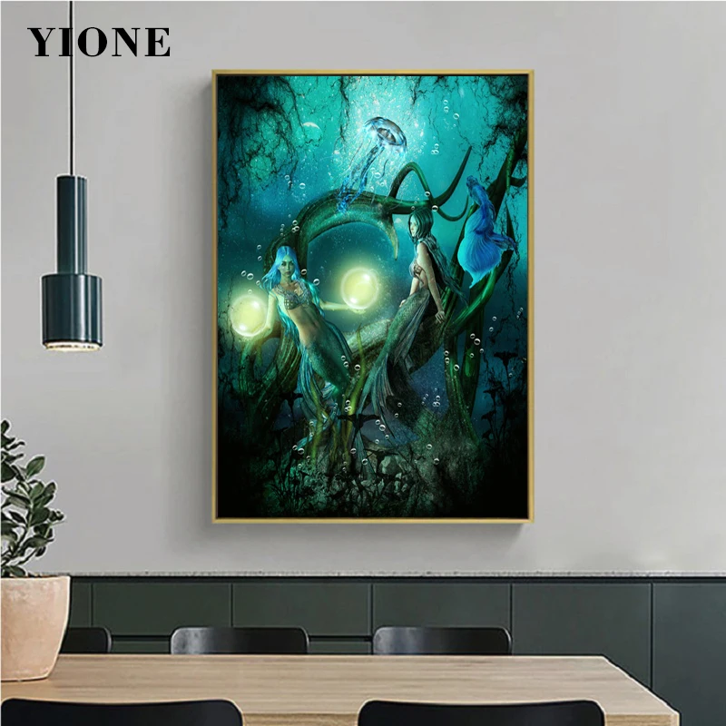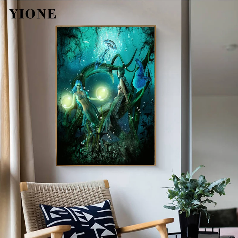 Плакат в стиле ретро с изображением глубокого моря, русалки, сказки темного цвета, холст с рыбой, картина, Настенная картина для спальни, галереи