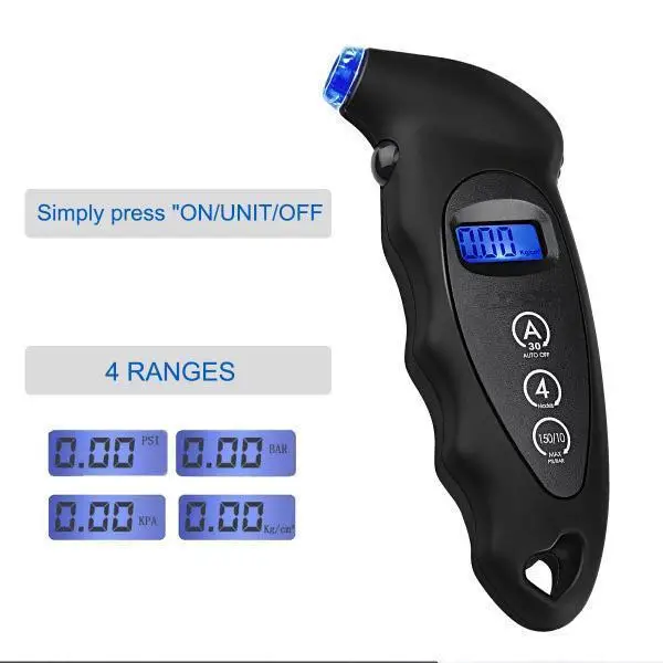 Светильник ED Насадка & Дисплей: с синей подсветкой ЖК-дисплей дисплеем и подсветкой насадка для видимости в тускло-светильник и помогает регулировать насадку к клапану для герметизации хорошо. Универсальное использование для автомобилей, грузовиков, мотоциклов, велосипедов и т. д., но этот манометр предназначен только для клапана Schrader, адаптер необходим для других клапанов, таких как Presta.