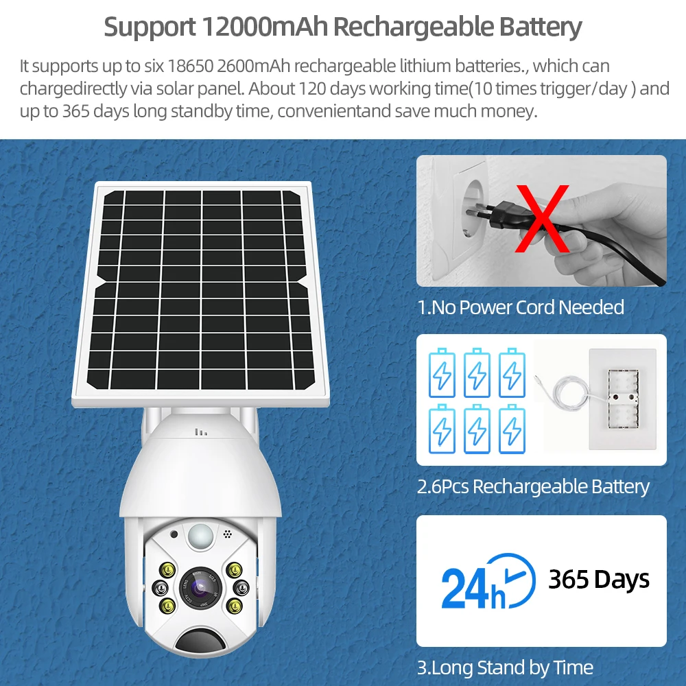 Подключите камеру к солнечной панели 8 Вт, и она будет получать бесперебойную мощность весь день и всю ночь. Вы можете легко разместить устойчивые к атмосферным воздействиям солнечные панели для максимального воздействия солнечных лучей. Это экономит проблему ручной зарядки камеры.