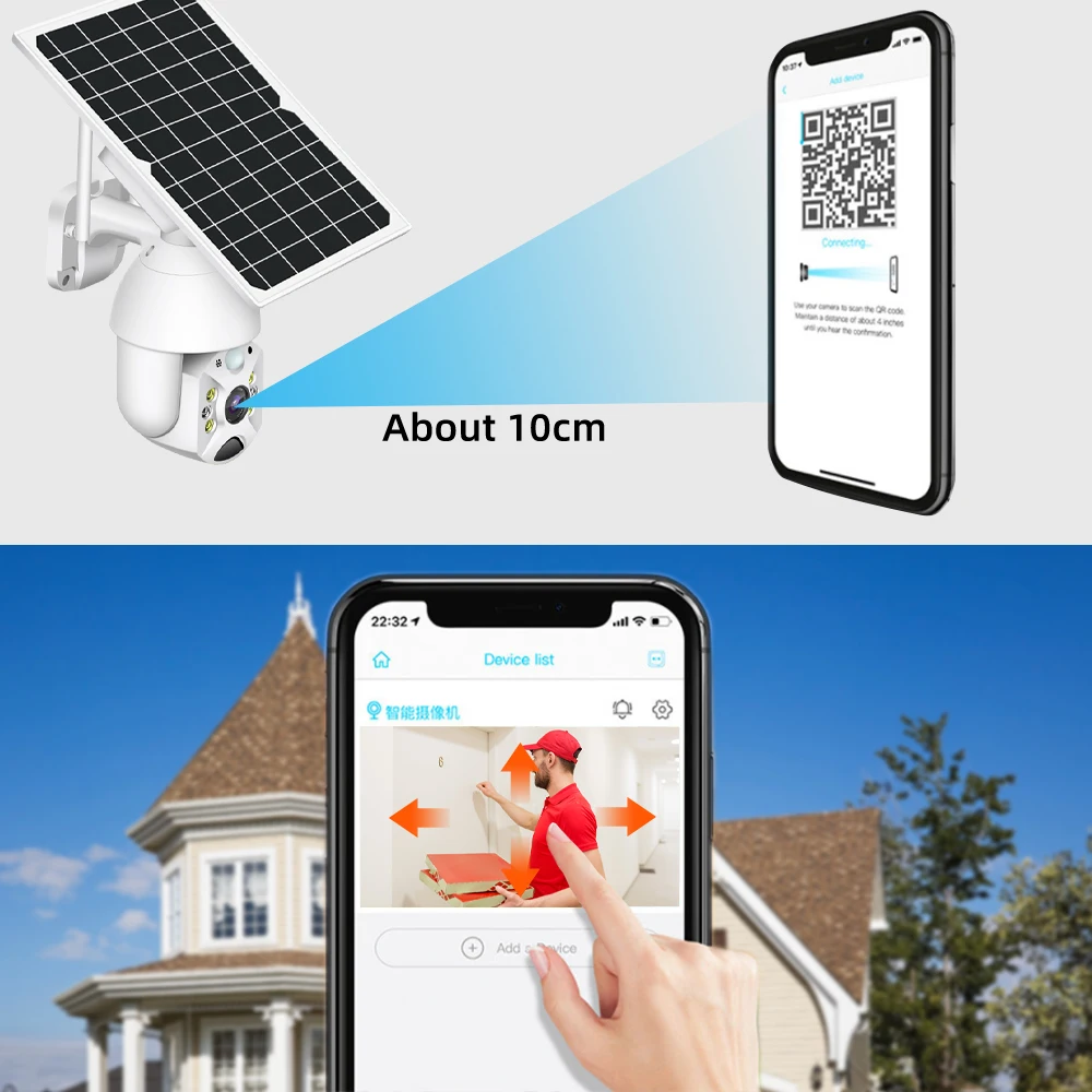 100% провода бесплатно и легко установить; Отсканируйте qr-код для подключения камеры безопасности к вашему телефону через бесплатное приложение; Бесконтактный Солнечный источник питания с собственной солнечной панелью и батарейным блоком