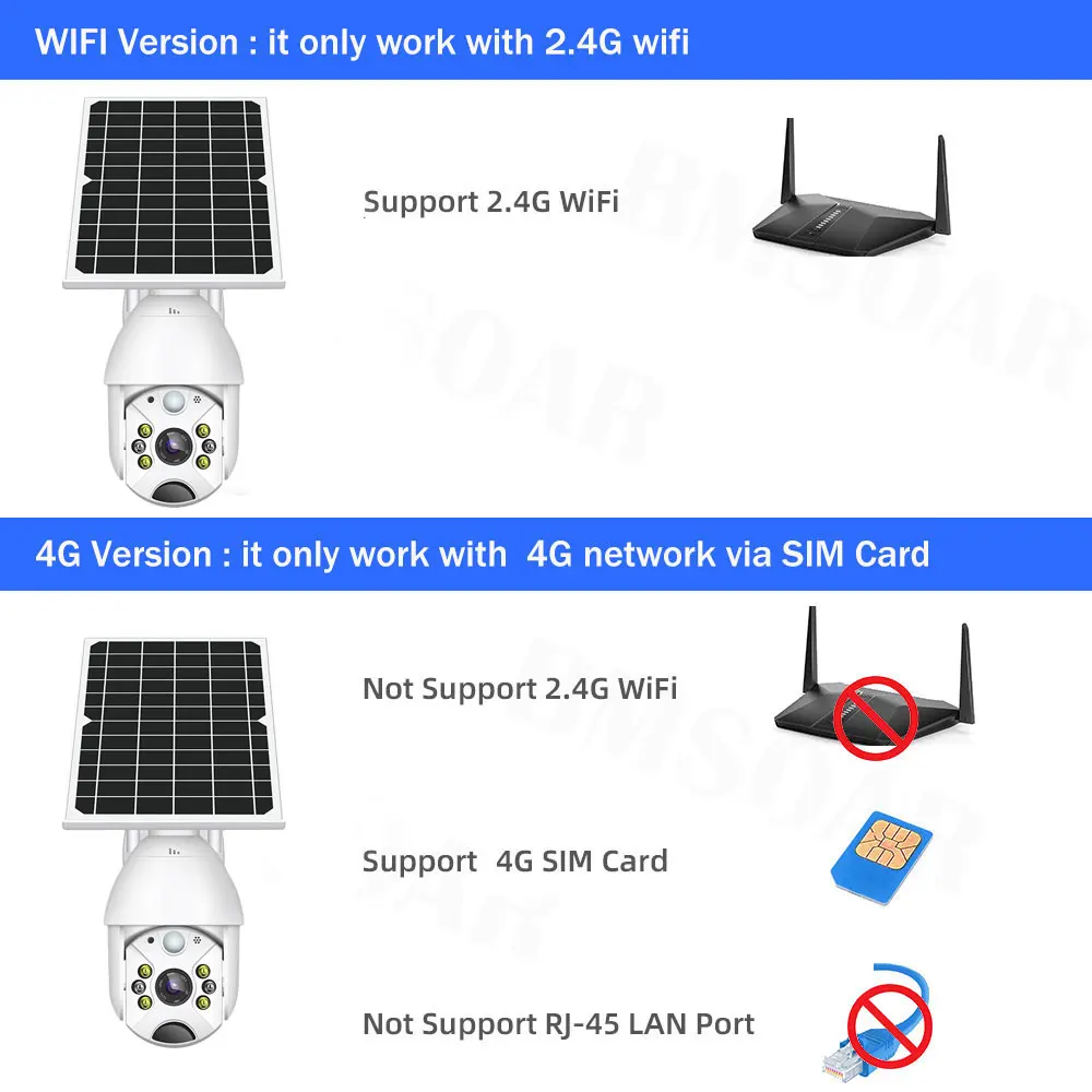 4G камера Установите sim-карту для работы, нет необходимости в маршрутизаторе, нет рабочего диапазона, даже если дом выключен, солнечные камеры 4G по-прежнему работают нормально. Wi-Fi камера требует Wi-Fi networkisneed, и установлен рядом с маршрутизатором, он с рабочим диапазоном