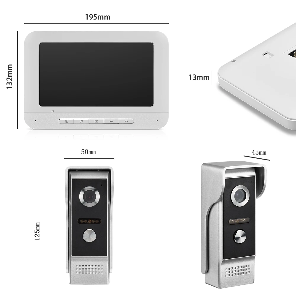 Монитор:• Функция: Интерком, без рук, монитор, разблокировка Отрегулируйте светильник/цвет/громкость• Источник питания: Входной AC100-249V• Выход: 15 В постоянного тока 1500ма• Экран Размеры: 7 дюймов Цвет TFT-LCD• Разрешение: 800x480• Чехол: АБС-пластик• Размеры: 195*132*13 мм• Вес: 0,6 кгНаружная панель вызова: наружная камера• Камера: Компенсация супер-подсветки 1000CMOS• Дальность ночного видения: WLED 3 м• Чехол: цинковый сплав• Угол обзора: 85-92 градусов• Размеры: 50x125x27 (мм)• Установка: поверхностное крепление• Чистый Вес: 0,35 кг