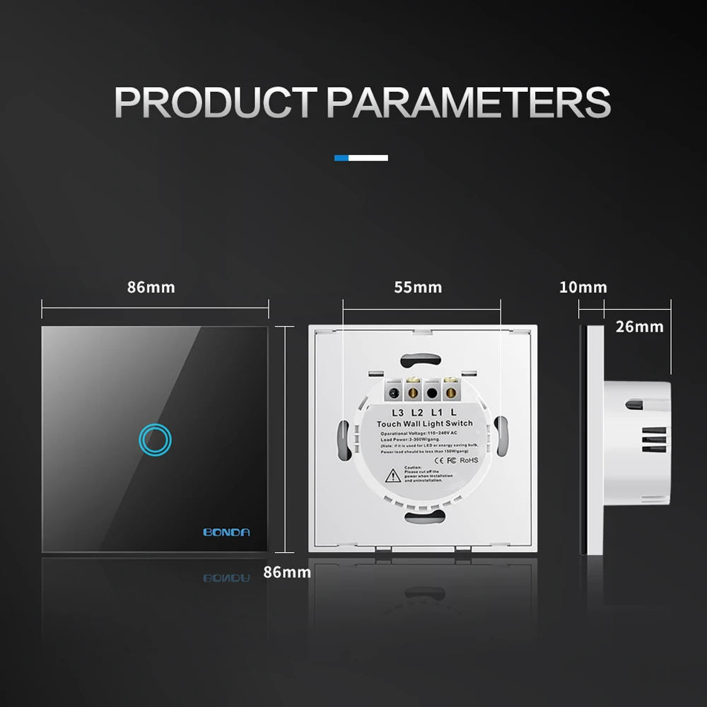 1. Название бренда: BONDA2. Кнопка: 1 банда, 2 банды, 3 банды на выбор3. Цвет: черный, белый, золотой4, Размер: 8,6*8,6*3,5 см/3,4*3,4*1,4 "(Д * Ш * В)5, ток: 10A6, Ватт: 5-300 Вт/комплект7. Рабочее напряжение: 170-240 В переменного тока8, Рабочая температура: -20 ℃ ~ + 70 ℃9, относительная влажность: 10% ~ 90%10. Механический срок службы: 100000 раз11, Сертификация: CE,CCC ,ROHS12, Гарантия: 1 год13, время доставки: <1 день получил ваш заказ14, вес брутто: 0,15 кг/5,25 oz Вес нетто: 0,14 кг/4,9 oz15, размеры посылка: 9,0*9.0x4.0 см/3,5x3,5x1,55 (Д * Ш * В)