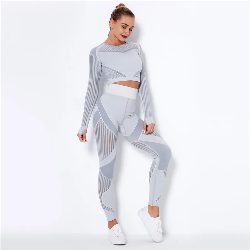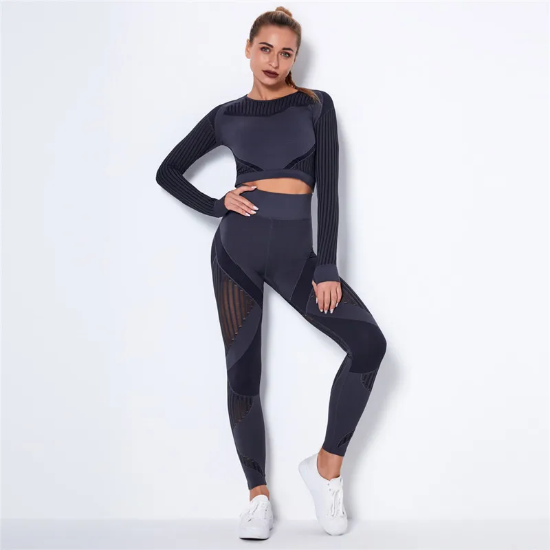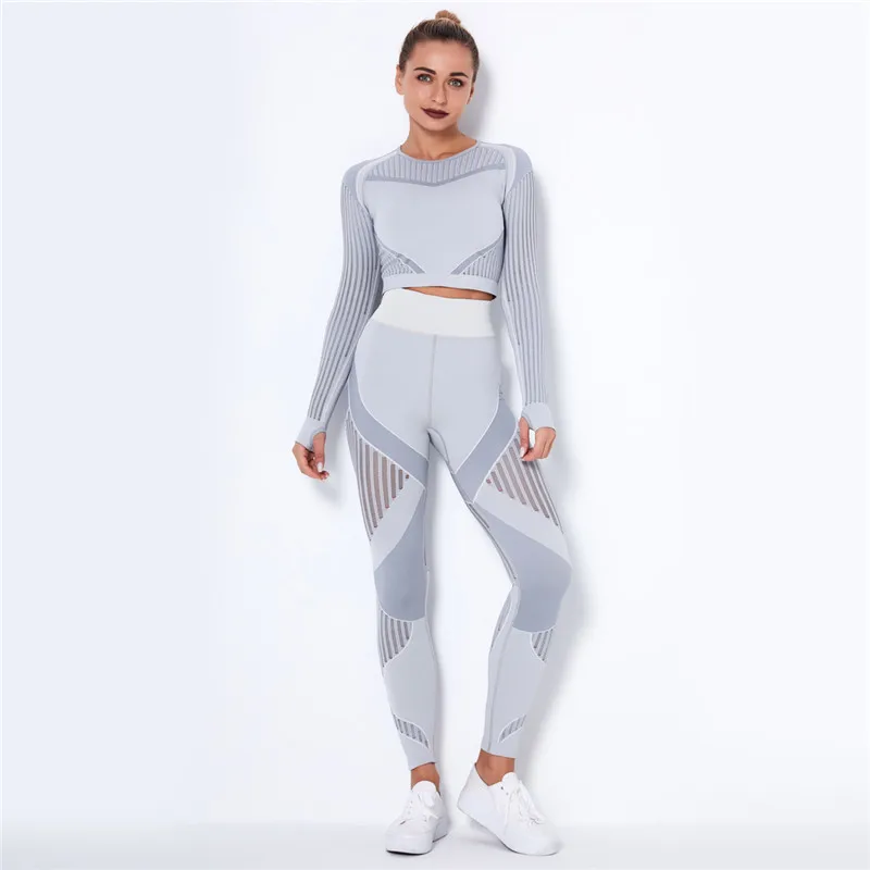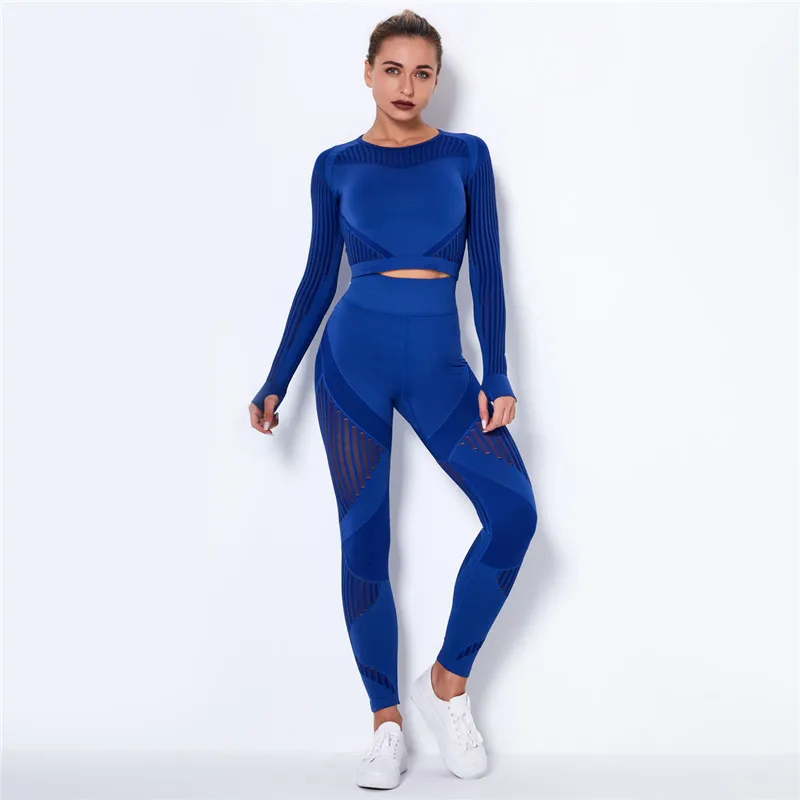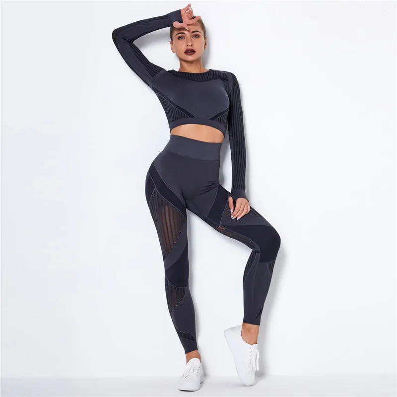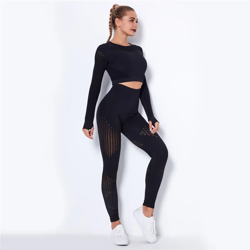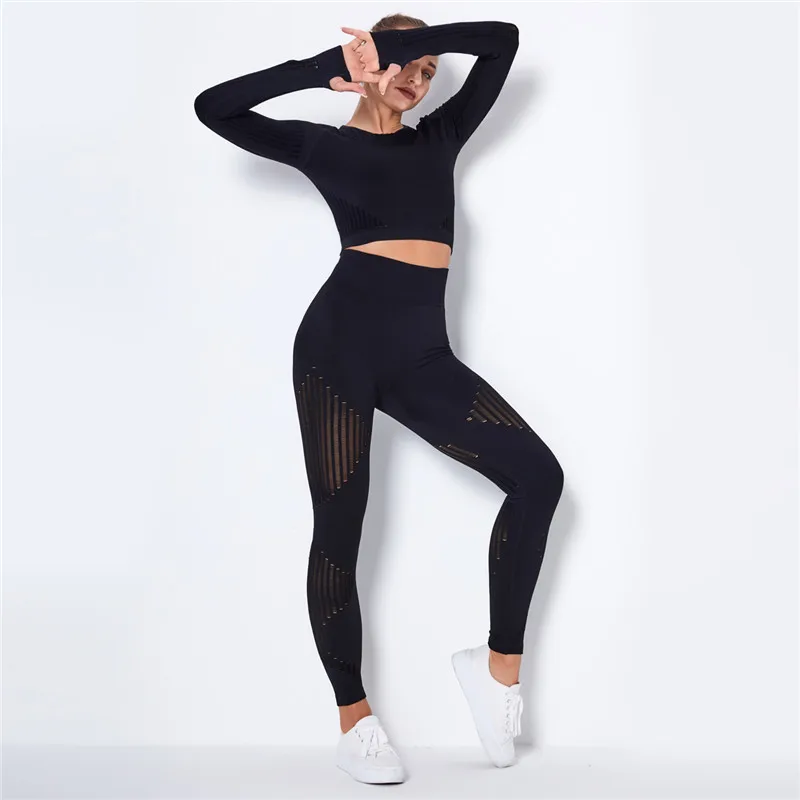 Женский бесшовный спортивный комплект, леггинсы для спортзала и фитнеса, ажурная рубашка, спортивный костюм, женский спортивный костюм с длинным рукавом, одежда для активного отдыха 2022