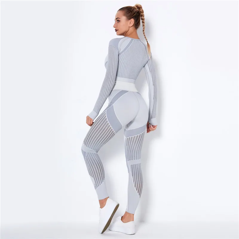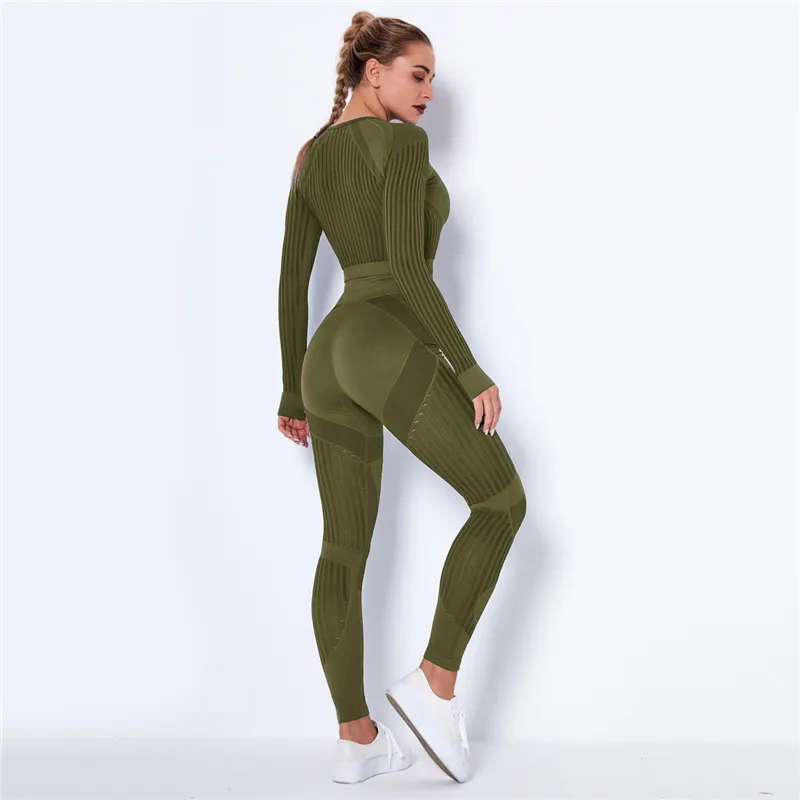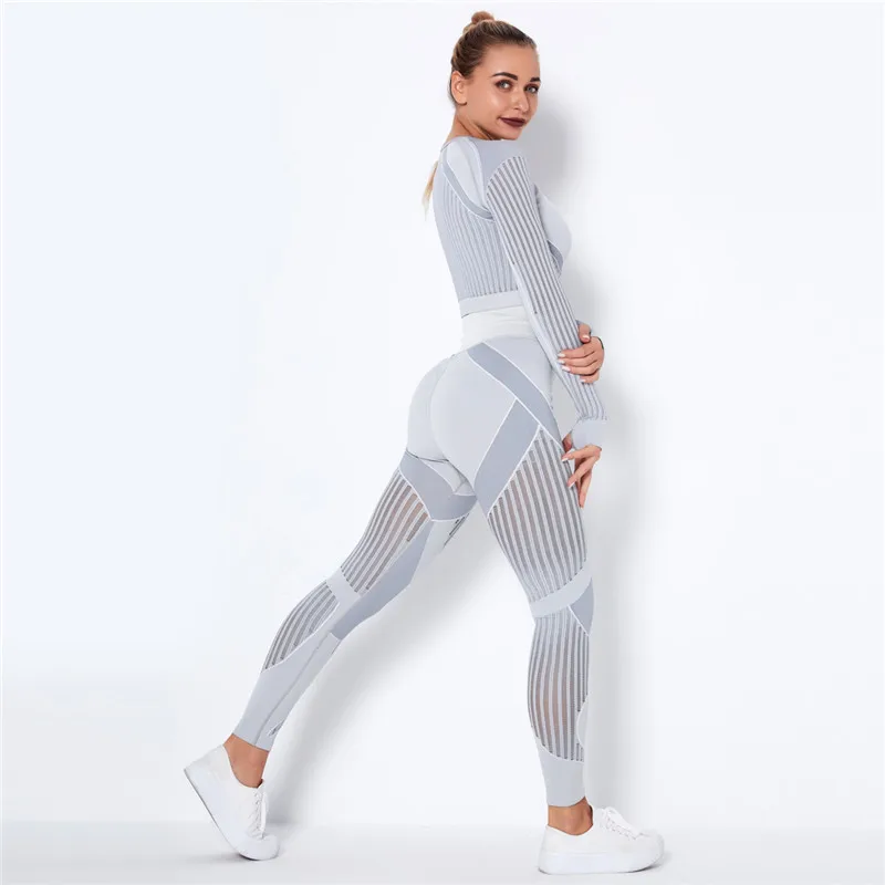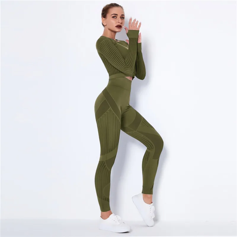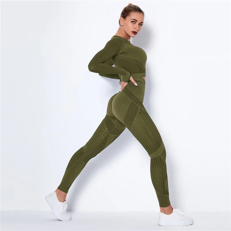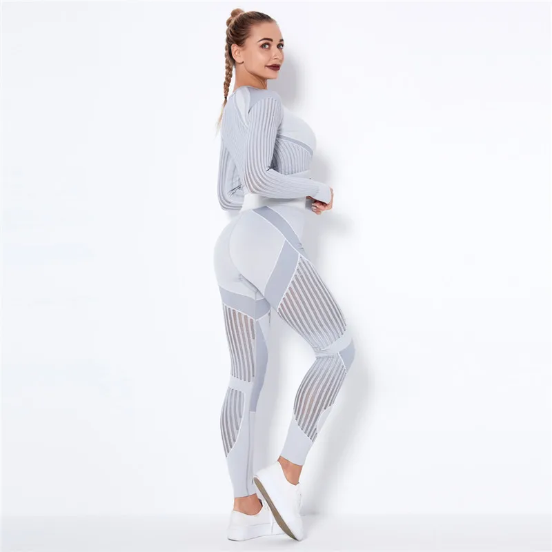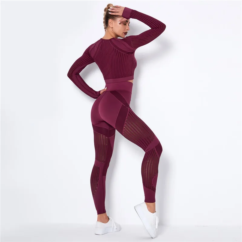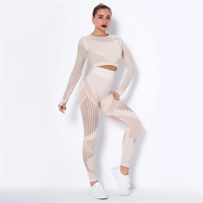 Женский бесшовный спортивный комплект, леггинсы для спортзала и фитнеса, ажурная рубашка, спортивный костюм, женский спортивный костюм с длинным рукавом, одежда для активного отдыха 2022