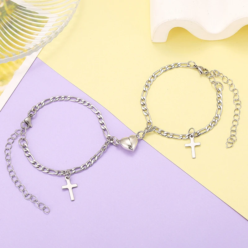 Регулируемая цепочка, браслет для пары, простой браслет из нержавеющей стали с магнитным сердечком, браслет на запястье, крест, украшения, подарок