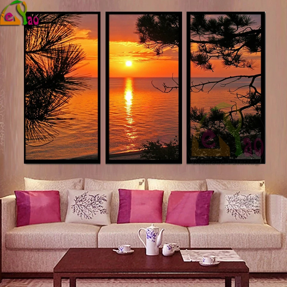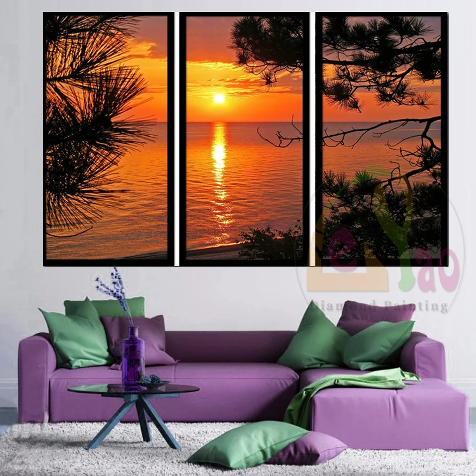 Триптих закат на озере пейзаж брильянтовая картина крестом полный дрель мозаичная картина, выполненная в технике алмазной вышивки Декор для дома ручной работы
