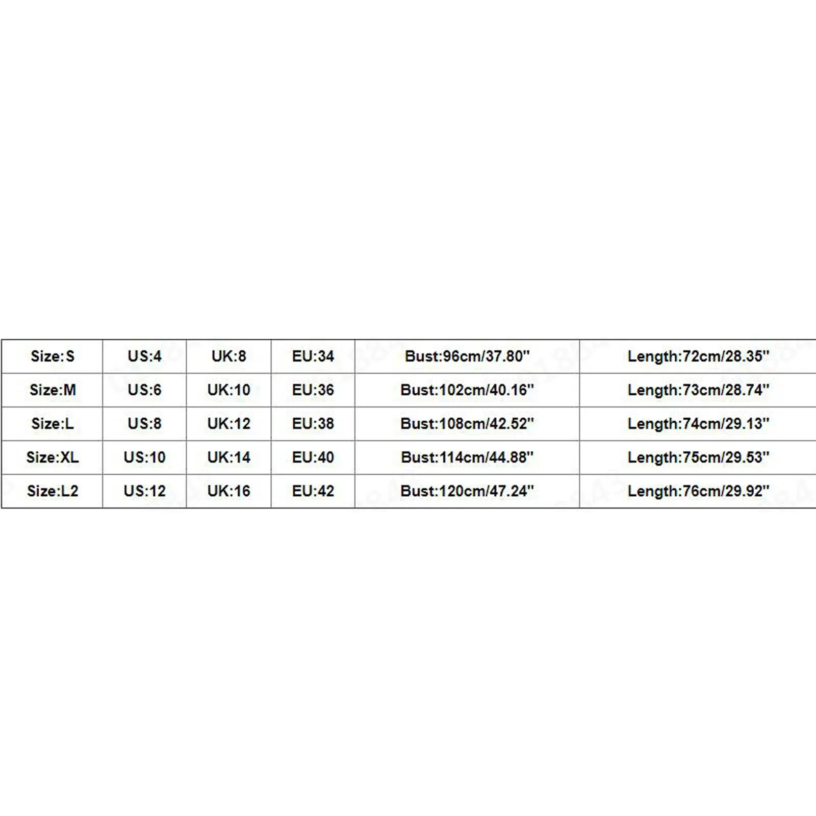 Размер: S США: 4 Великобритания: 8 ЕС: 34 Обхват груди: 96 см/37,80 дюйма Длина: 72 см/28,35 дюйма Размер: M США: 6 Великобритания: 10 ЕС: 36 Обхват груди: 102 см/40,16 дюйма Длина: 73 см/28,74'' Размер: L США: 8 Великобритания: 12 ЕС: 38 Обхват груди: 108 см/42,52 дюйма Длина: 74 см/29,13 дюйма Размер: XL США: 10 Великобритания: 14 ЕС: 40 Обхват груди: 114 см/44,88 дюйма Длина: 75 см/29,53'' Размер: L2 США: 12 Великобритания: 16 ЕС: 42 Обхват груди: 120 см/47,24 дюйма Длина: 76 см/29,92''