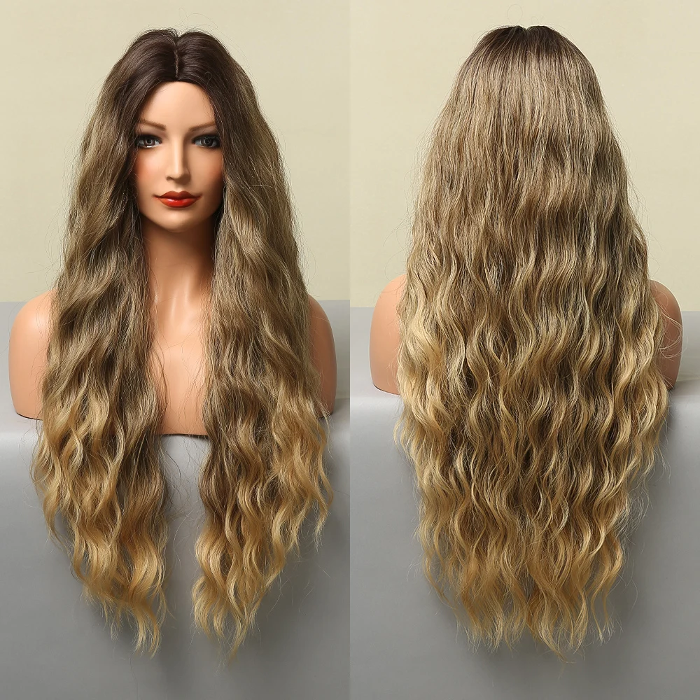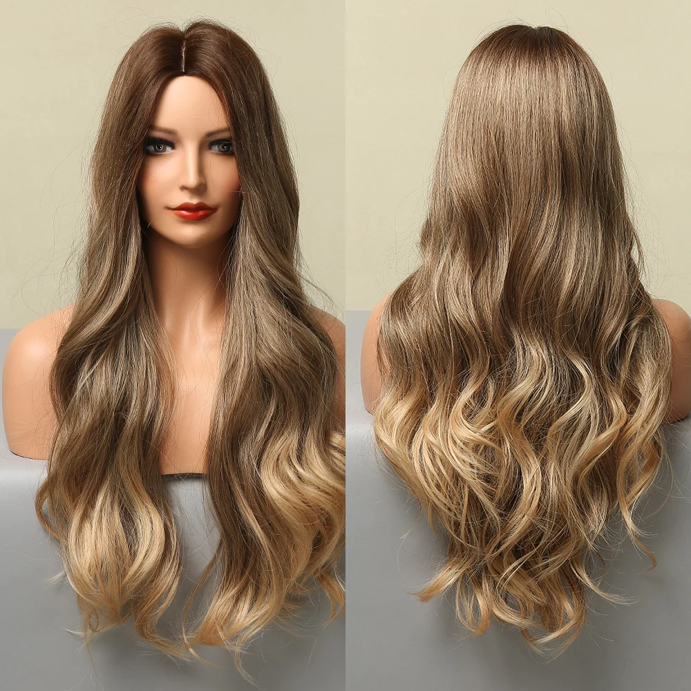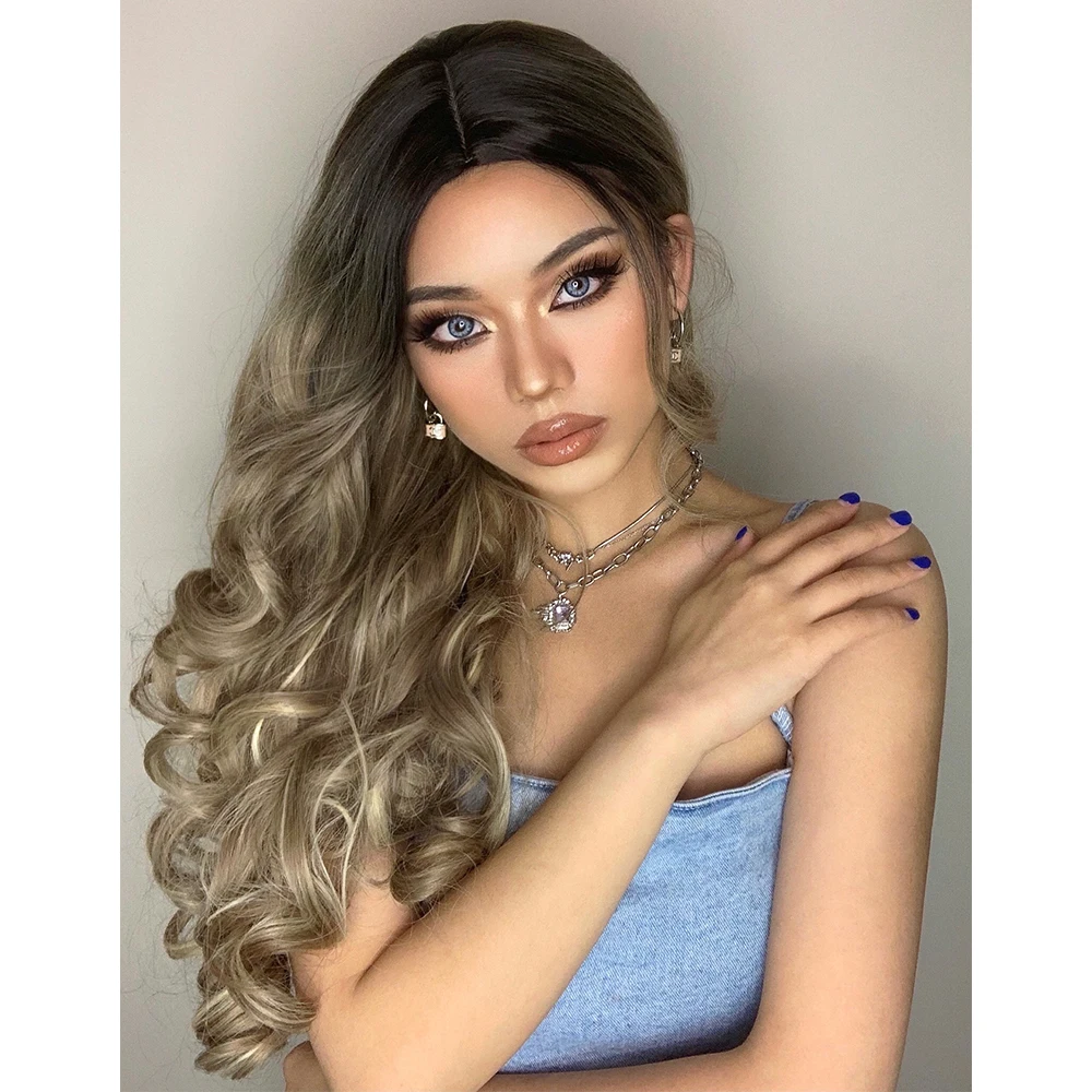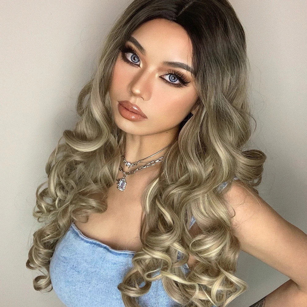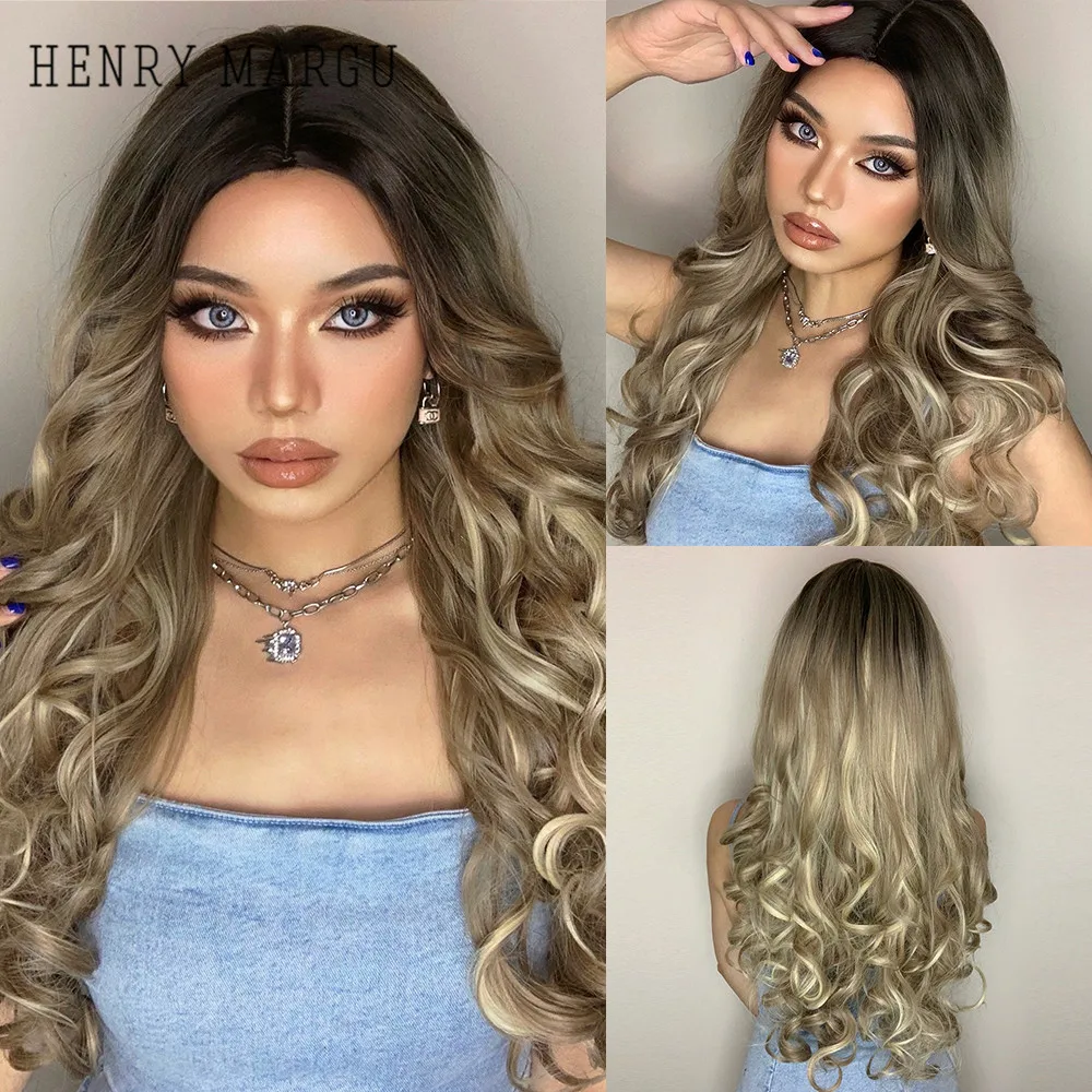 Генри MARGU эффектом деграде (переход от темного к коричневого цвета шампанского блондинка изюминка Длинные свободные волны парик из синтетических волос натуральные накладные волосы для Для женщин термостойкие