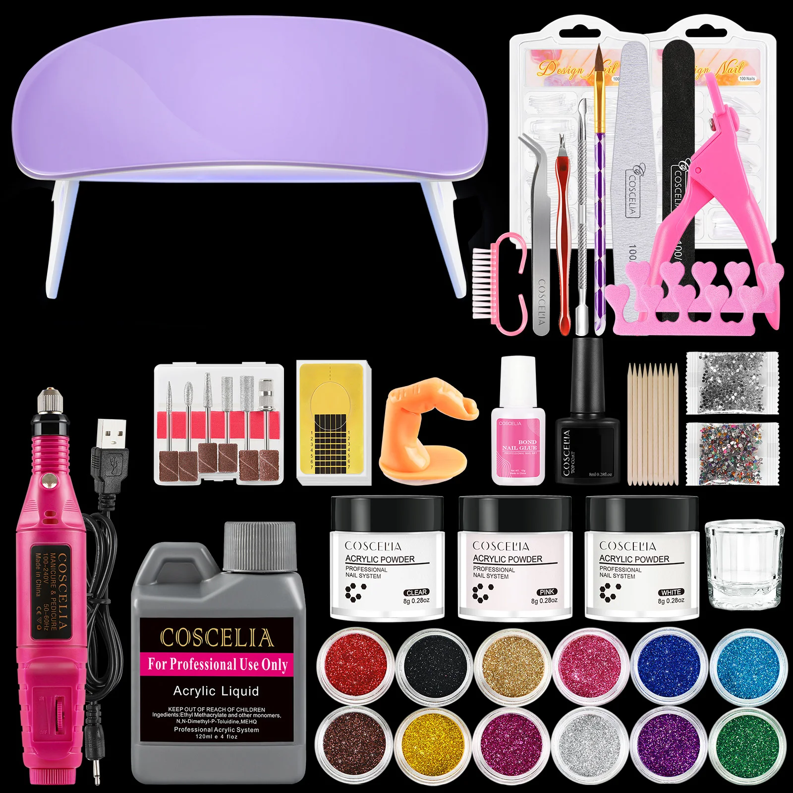 Набор акриловых ногтей COSCELIA с лампой для ногтей, сверлильный ап...