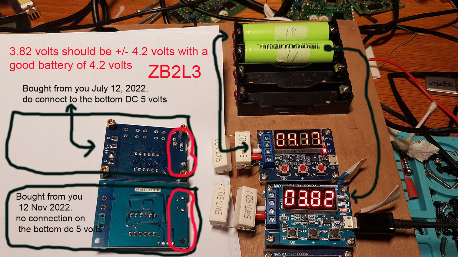 Зарядное устройство для аккумулятора 18650 1A Lipo хорошо, но тестеры ZB2L3, которые я купил у них, являются поддельными. Это вторая отправка от продавца, первая хорошая, а вторая не куплена 14 штук. Во-первых, все тестеры емкости батареи ZB2L3, которые вы покупаете на aliexpress, имеют соединение 5 вольт постоянного тока в нижней части, а не это. Первая доставка тоже была такой же, но вторая не была. И Высчитывает 0,38 вольт слишком мало, поэтому батарея показывает слишком мало Ач в конце теста. Продавец отвечает только с обзором того, что он может сделать. Нет объяснений по поводу разницы. Они не хотят возмещать 10 евро, даже одну третью 36,11 евро Смотрите фотографии Поэтому не покупайте ZB2L3.