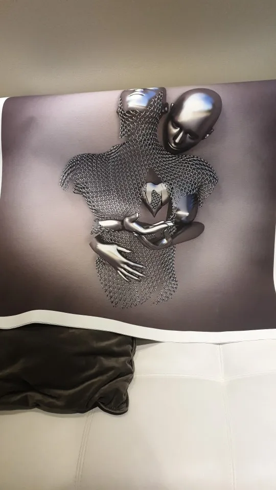 Это просто гладкий постер. Думала будет объёмным, а это просто нанесение. Смотрится красиво, но надо быть готовым к тому, что его надо натягивать на раму. Никакого металла нет