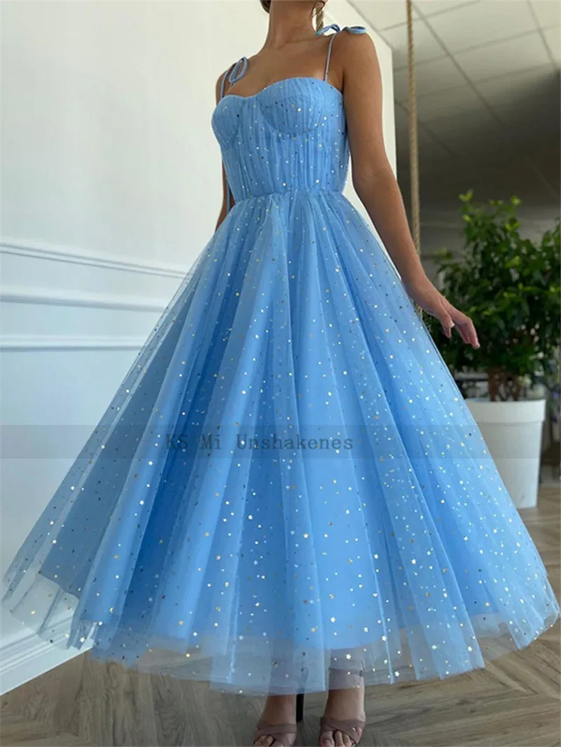 Синие Блестящие тюлевые платья для выпускного вечера со звездами 2021, недорогое скромное короткое платье на бретелях для выпускного вечера, платья для вечеринки, платья длиной ниже колена