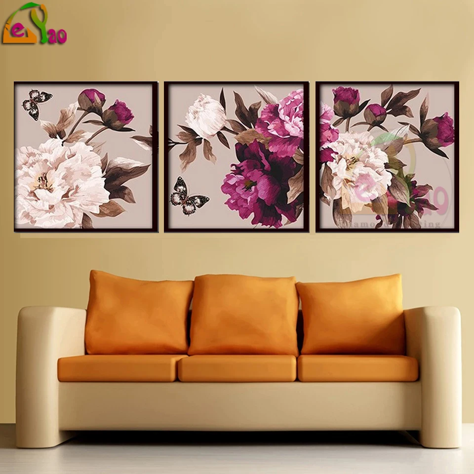 Пионы и бабочки Триптих 5D Diy алмазная живопись Ретро Цветы полный квадрат дрель вышивка крестиком Мозаика домашний декор