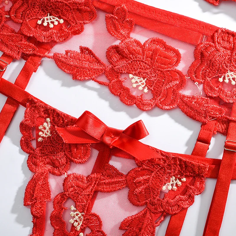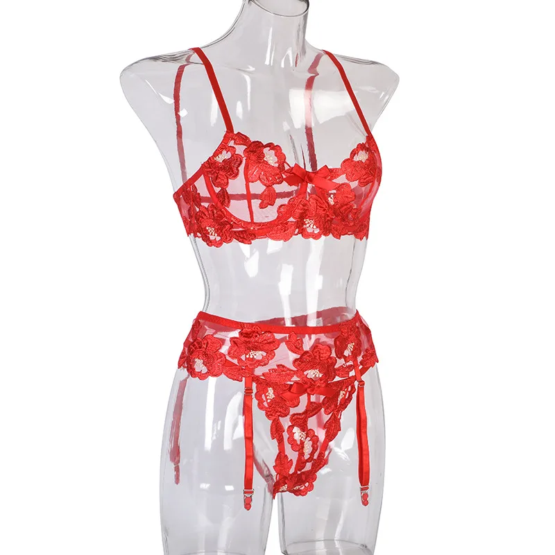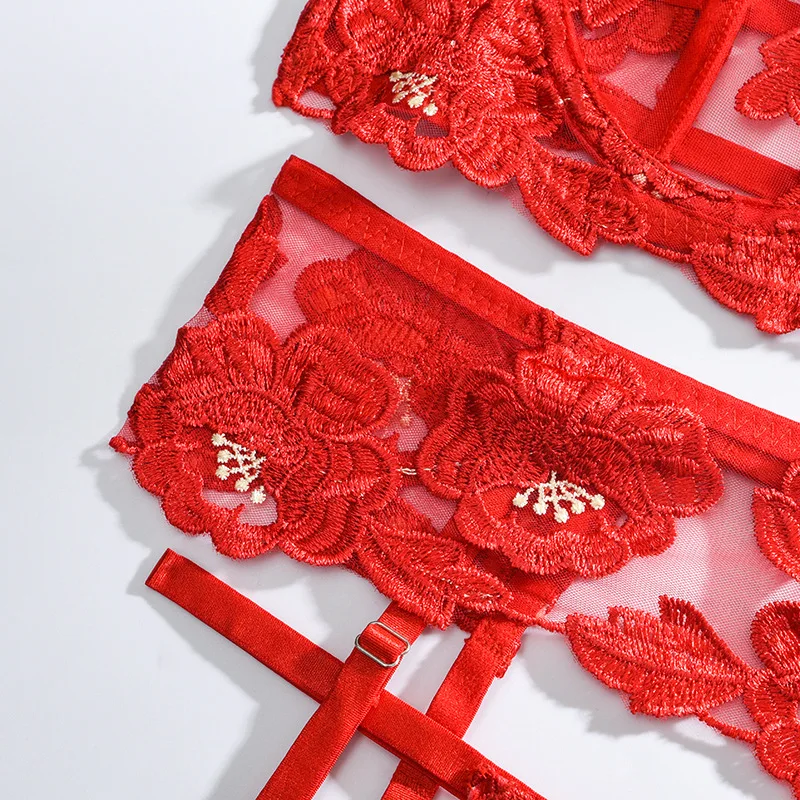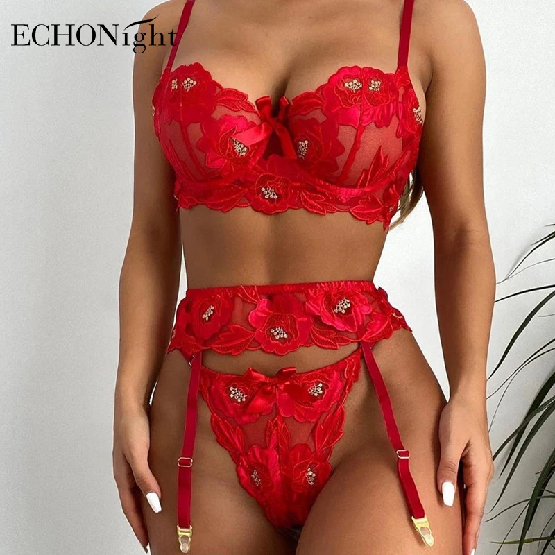 Сексуальный кружевной комплект нижнего белья Echonight, красное цветочное нижнее белье, сексуальный комплект из 3 предметов, бюстгальтер пуш-ап на косточках, нижнее белье, женские кружевные комплекты нижнего белья