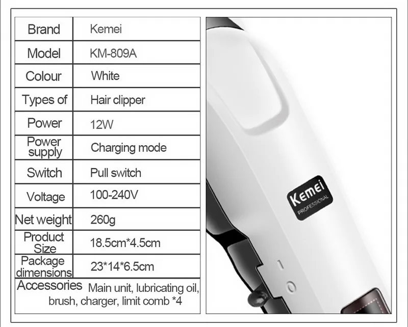 1,100 v-240v напряжение переменного тока, 50/60 Гц, перезаряжаемый аккумулятор дизайн2. Профессиональные парикмахерские инструменты, или бытовые3. Светодиодный дисплей4. Лезвие из нержавеющей стали, резкая и быстрая резка5. Низкий уровень шума, высокая мощность6. Быстрая и безопасная зарядка, нормальное рабочее время составляет 300 минут7. Мотор из медной проволоки, срок службы 5 лет, непластиковый мотор8. Подходит для (мужчин, женщин, пожилых людей)
