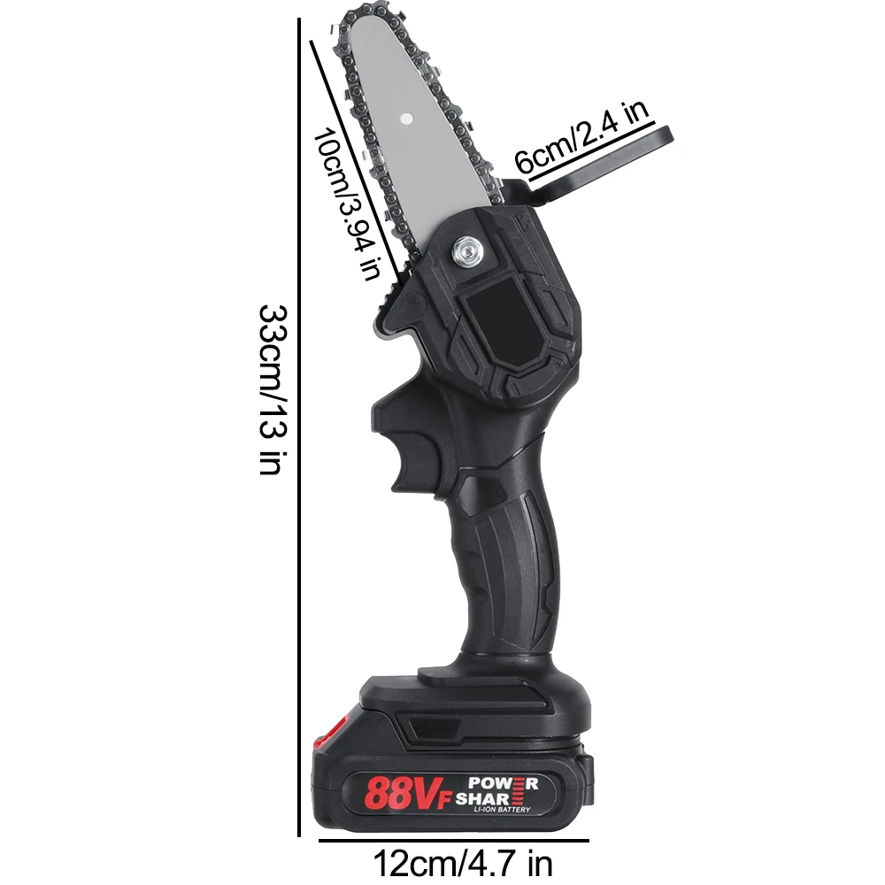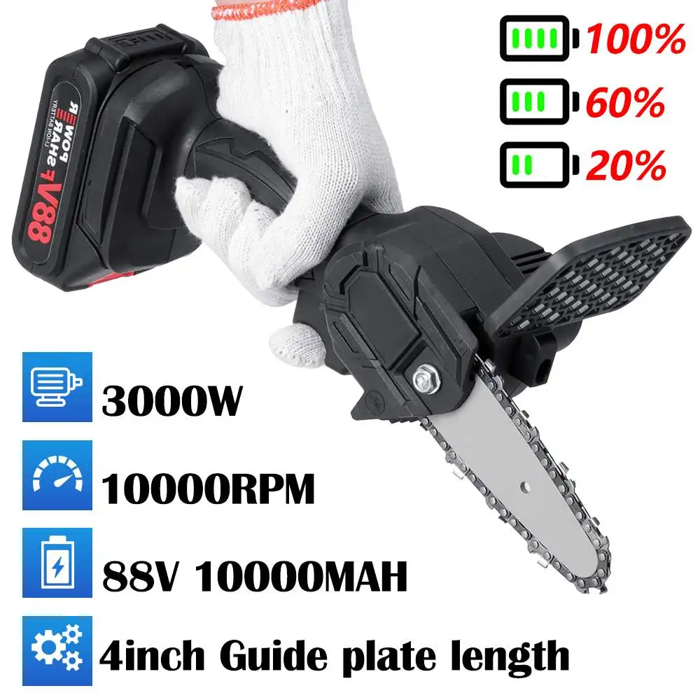 Особенности товара:Цвет: черныйНапряжение: 88 вМощность: 3000 ВтМатериал: АБС + стальДлина направляющей пластины: 4 дюймаСкорость цепи: 5 м/сЦепь: быстрая регулировкаБыстрая зарядка: 1,5 (3) часСкорость вращения: 10000р/минЕмкость аккумулятора: 10000 мАчКоличество аккумуляторов: 1/2Режущий Диаметр: 100 мм/3,9 ВРазмер корпуса: 12x33 см/4,7x13 дюймов