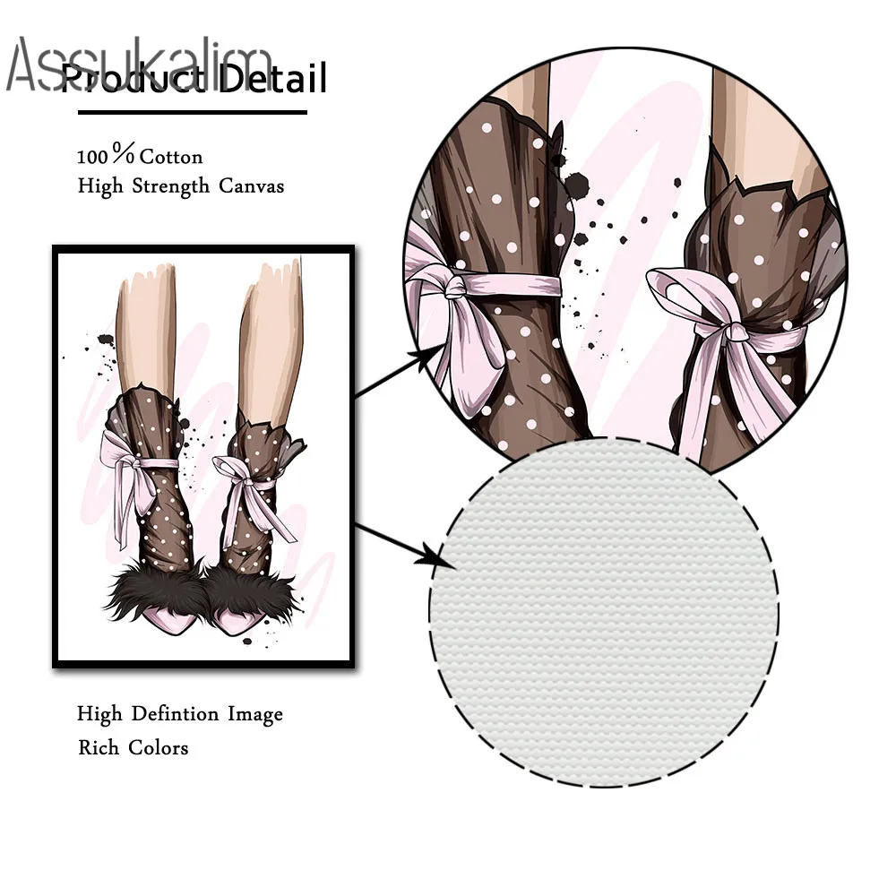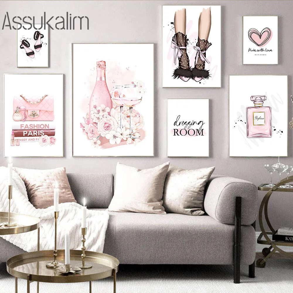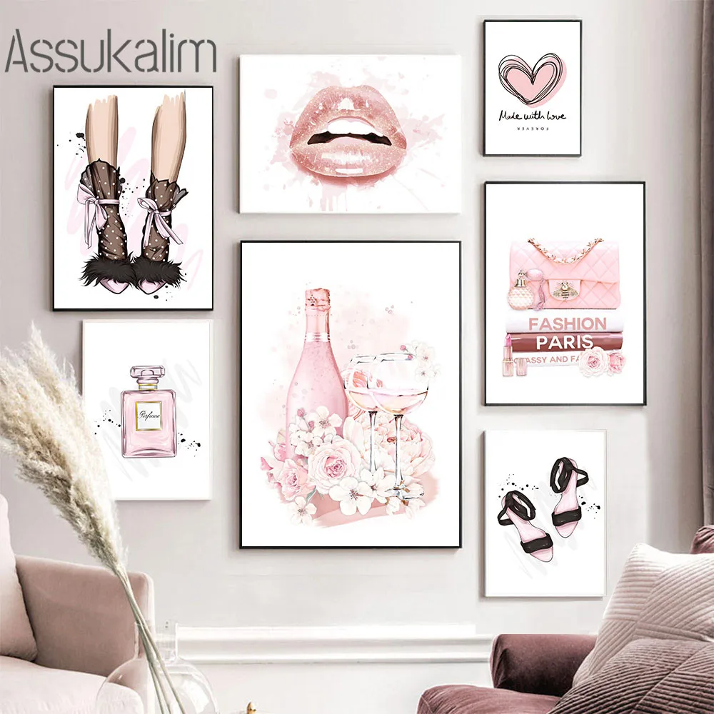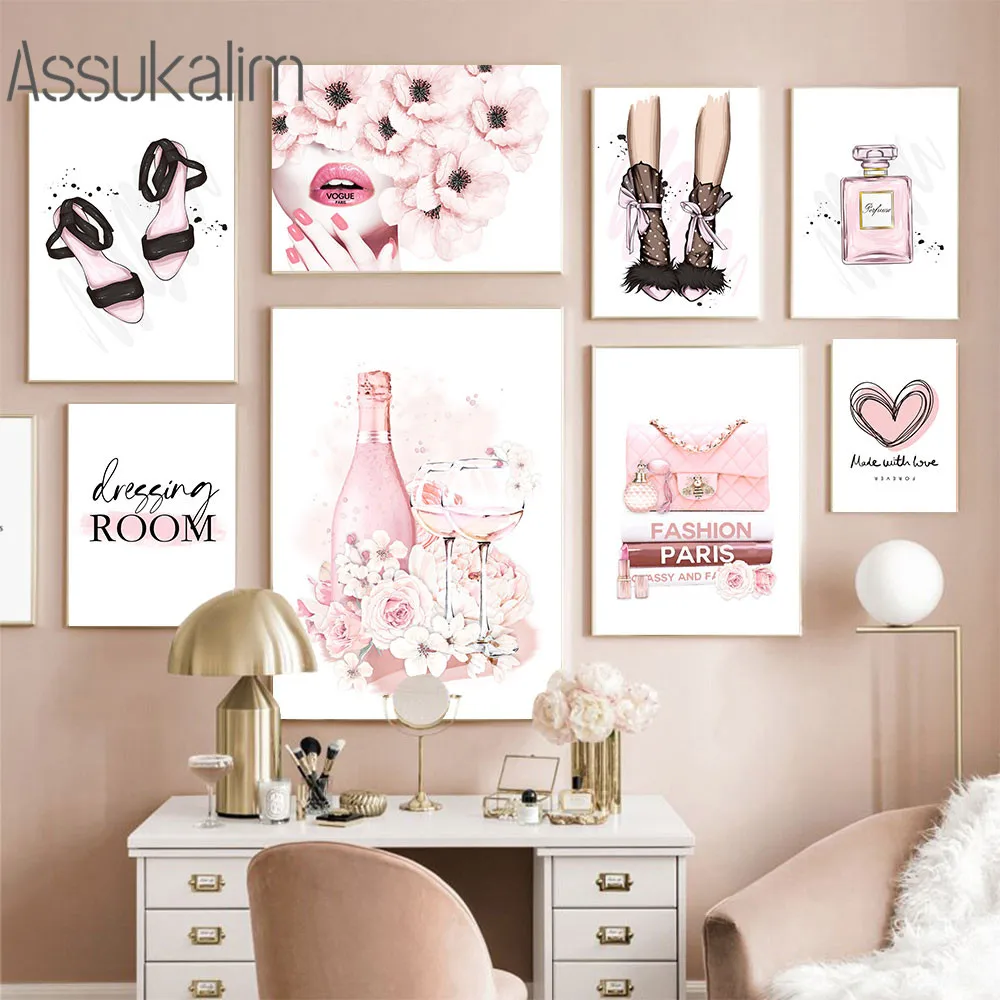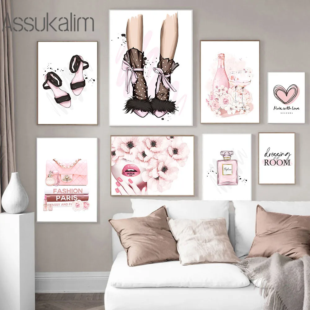 Модная настенная Картина на холсте, постер с флаконом духов, цветочные плакаты на высоком каблуке, печать, настенные картины в скандинавском стиле для декора комнаты для девочек