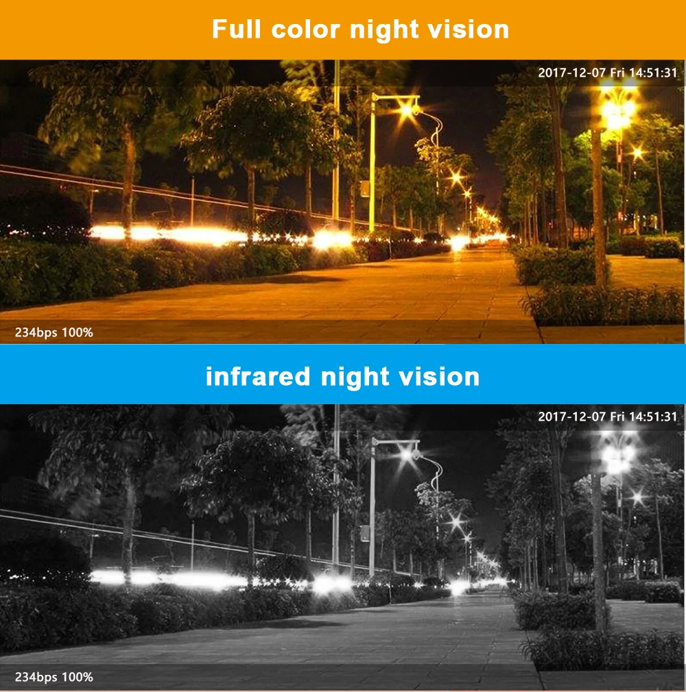 Переключение на"Полноцветное ночное видение«Режим, камера работает с четырьмя белыми лампами, экран монитора-это полноцветная картинка, картинка настоящая и может шокировать вора, Дневной эффект-это цветная картинка.