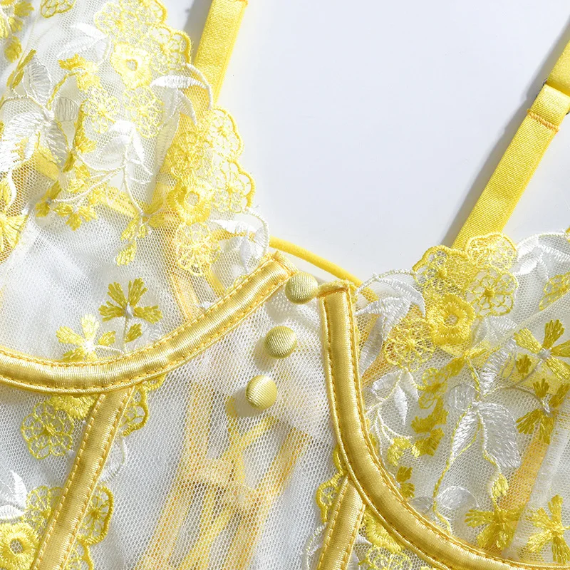 Сексуальное чувственное нижнее белье Боди женское нижнее белье Эротический цветочный вышивка прозрачный сетчатый бюстгальтер и стринги набор экзотических костюмов