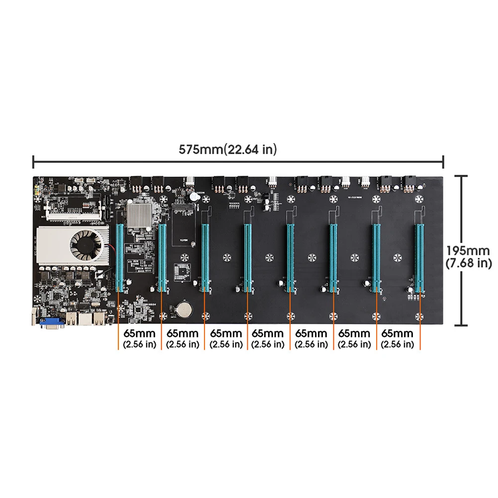 Материнская плата BTC-S37 Pro Mining 8 PCIE 16X, графическая карта SODIMM DDR3 SATA3.0, поддержка VGA + HDMI, Совместимость с BTC, аксессуары для шахтеровОсобенность:1. Слот для видеокарты 8xpcie 16X, шаг 575 мм.2. Высокая вычислительная производительность, на 10% выше материнской платы того же уровня.3. Оснащен слотом памяти Sodimm DDR3, разъемом питания 8x6PIN PCIE X16, что значительно улучшает производительность материнской платы.4. Стабилизирующий конденсатор может обеспечить стабильное напряжение для вашего источника питания.5. Это может обеспечить тихую производительность, низкое энергопотребление, низкое тепловыделение, энергосбережение и безопасное использование.Спецификация:Модель: BTC-S37Цвет: черный + синийРазмер: 575x195 ммПамять: 1 слот DDR3 Sodimm, поддержка 1066/1333/1600 МГцХранение: 1 x SATA3.0 + 1 x SATA2.0 + 1 x m SATA2.0USB: 4 USB 2,0Сетевой порт: гигабитный сетевой порт RJ45Расширяемые порты: 8 x PCIE 16X, 8x6pin PCIE X16, разъем питания, совместимый с HDMI + VGAПримечание:В связи с различиями мониторов и эффектами освещения реальный цвет товара может немного отличаться от цвета на фотографиях. Спасибо!Возможны отклонения в 1-2 см из-за измерений вручную.