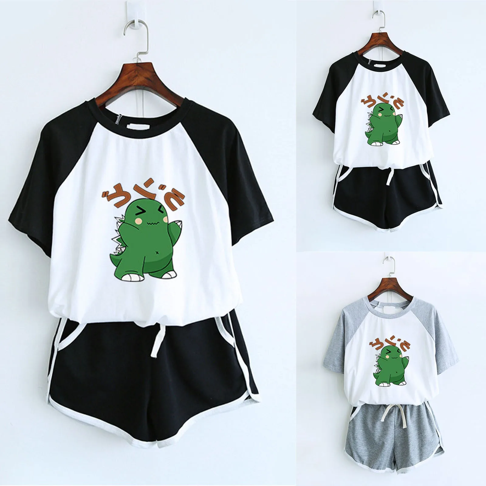 Летний женский пижамный комплект, одежда для сна с коротким рукавом и принтом в виде милых динозавров, модные шорты с карманами, домашний спортивный комплект, домашняя одежда