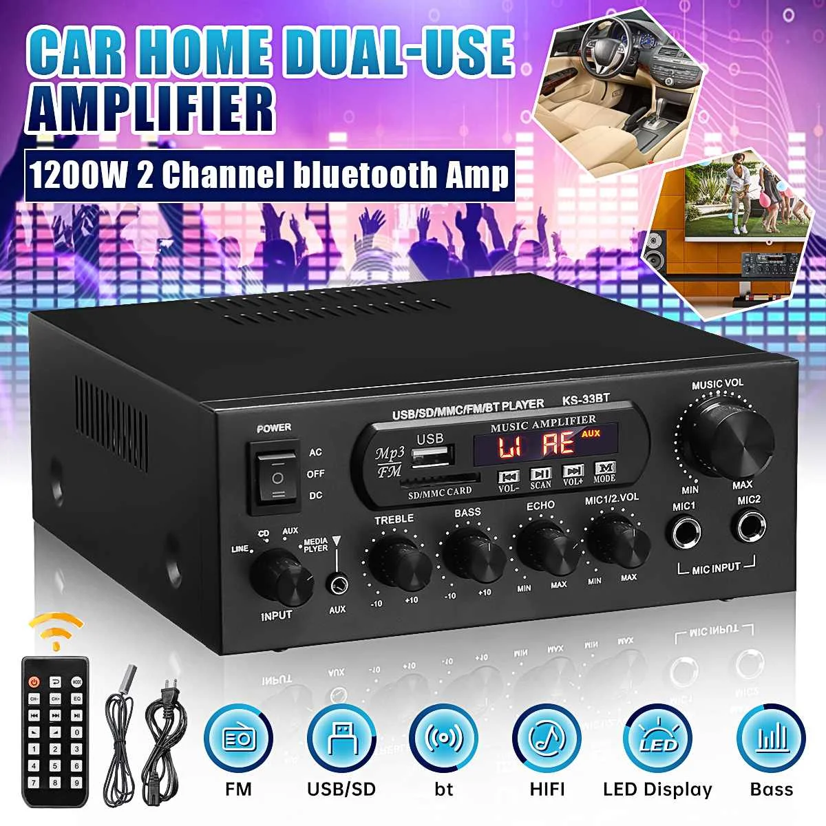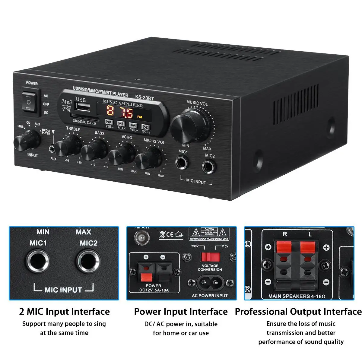 Особенности:-Цифровой mp3-плеер.-Интерфейс bluetooth для потоковой передачи музыки с мобильный телефон-Слот USB / SD для воспроизведения MP3 с карты памяти или карты-Поддерживает fm-стерео радио.-Поддержка 2 way вход для микрофона.-С высокими частотами, басами и регулятором громкости, очень прост в использовании.-Низкое Искажение обеспечивает более четкий, сильный и мощный звук.-2 канальный выход.-С функцией дистанционного управления.-Питание постоянного/переменного тока, подходит для домашнего использования.-Подходит для HiFi, систем домашнего кинотеатра и караоке