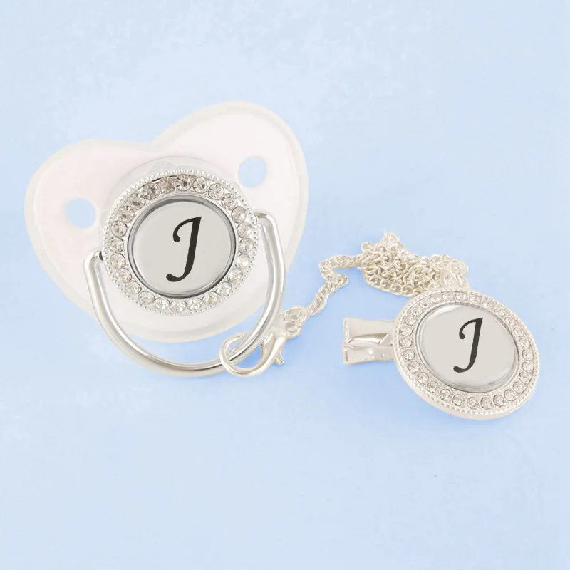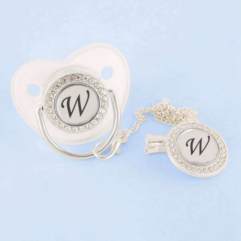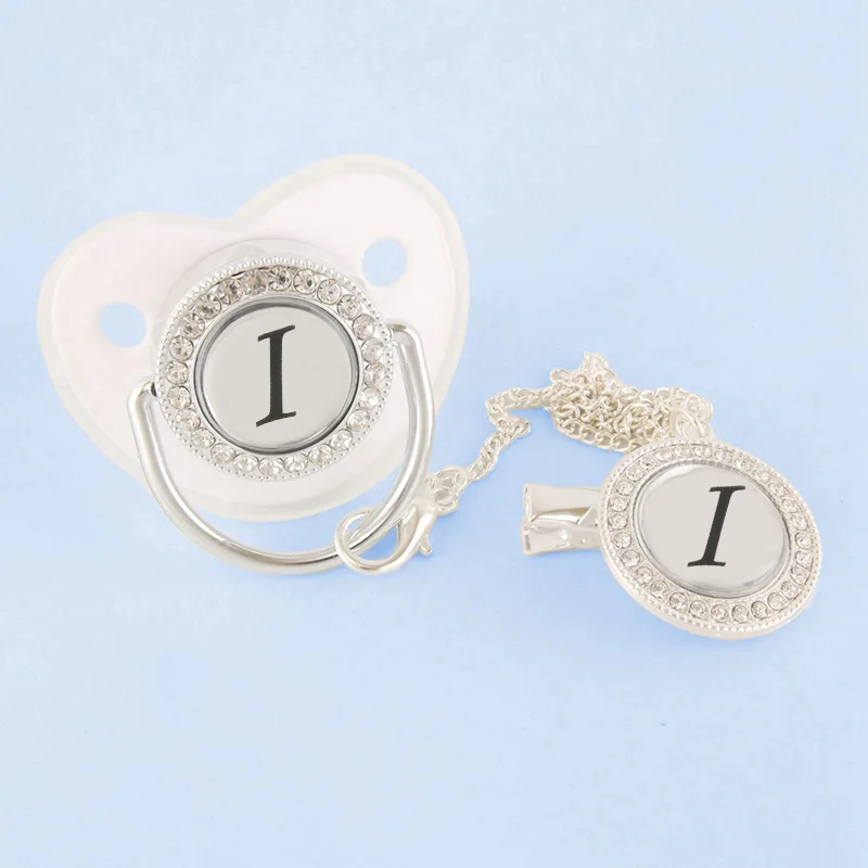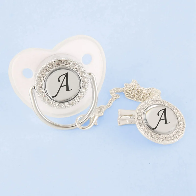 Соска-пустышка детская, серебристая, 26 букв, Со стразы