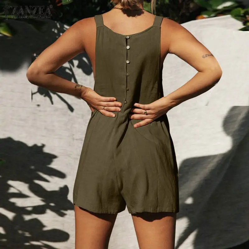 ZANZEA винтажные женские комбинезоны 2021 летние хлопковые льняные Комбинезоны повседневные однотонные на пуговицах сзади дамские Свободные Комбинезоны с карманами