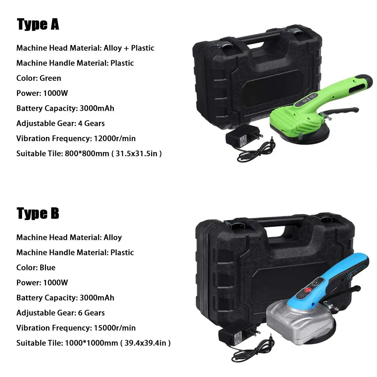 Тип B:(синий)Модель: BM-X7Материал головки машины: алюминиевый сплавМатериал ручки машины: пластикЦвет: синийМощность: 1000 ВтЕмкость аккумулятора: 3000 мАчРегулируемая передача: 6 передачПодходящая плитка: 1000*1000 мм (39,4х39,4дюйма)Частота вибрации: 15000р/минРазмер продукта: 24,8*10*12 см/9.8x3.9x4.7inВес изделия: 850 г