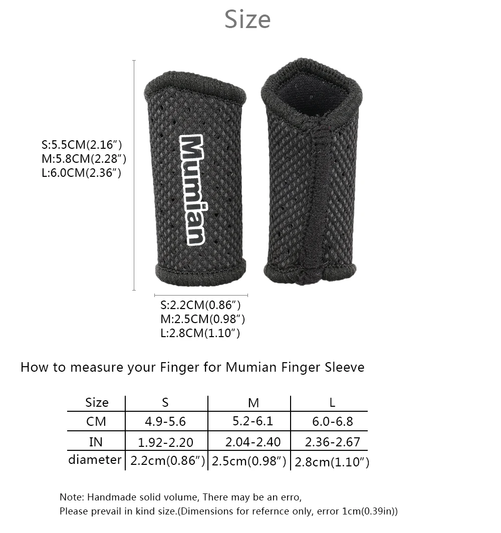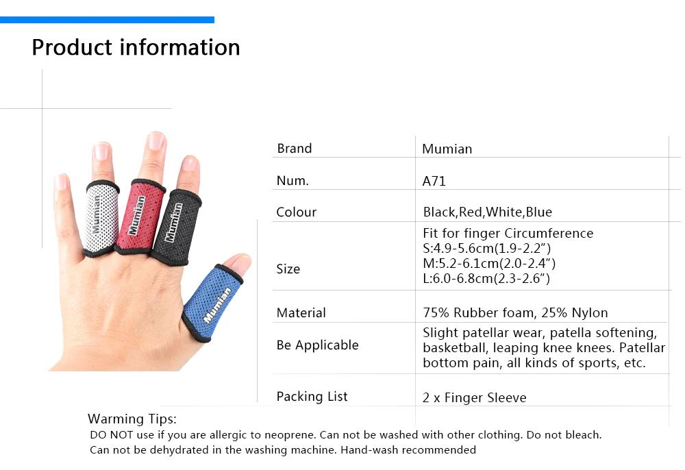 Бренд: MumianМодель: A71Цвет: черный, белый, синий, красныйМатериал: 75% неопрен, 25% нейлонРазмеры: S (4,9-5,6 см), M (5,2-6,1 см), L (6,0-6,8 см)Применение: предотвращает травму пальцев или травму после реабилитации.Особенности:1. Эластичные манжеты обеспечивают надлежащую фиксацию суставов пальцев2. Может разумно ограничивать костяшки в напряженных упражнениях под углом изгиба3. Твердые суставы