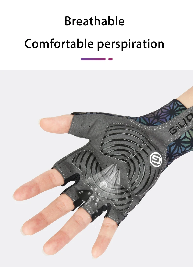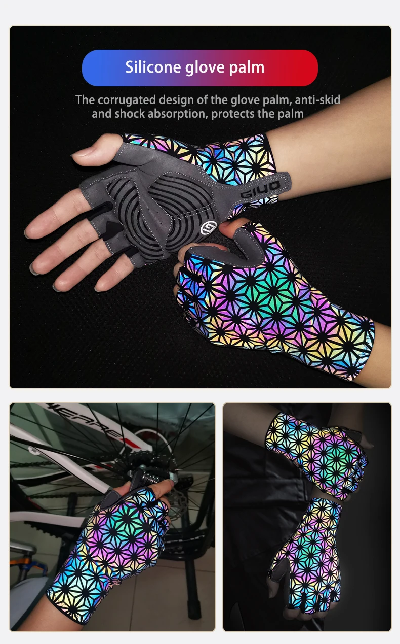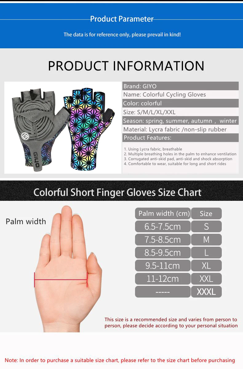 Бренд: GIYOНазвание продукта: красочные велосипедные перчаткиЦвет: цвет насыщенныйРазмер: S/M/L/XL/XXLСезон: весна, лето, осень и зимаМатериал: задняя сторона из лайкры/на ладони Нескользящая РезинаОсобенности:1. Задняя часть ручной работы изготовлена из лайкровой ткани, с низкой воздухопроницаемостью и низкой защитой от ветра2. Несколько дыхательных отверстий в ладони для улучшения вентиляции3. Гофрированные противоскользящие подушечки, противоскользящие и амортизирующие4. Удобно носить, подходит для долгих и коротких поездокДополнительные функции:* Он имеет отражающую функцию под светильник ночью, и цветные, отражающие перчатки делают его более безопасным для езды ночью* Универсальные перчатки: подходят для дорожного велоспорта, горного велосипеда, BMX, мотоцикла, вождения, тренировки, общих тренировок, бодибилдинга, упражнений и т. д.* Функциональность: велосипедные перчатки с мощной защитой от скольжения и амортизации, уменьшают воздействие дорожных вибраций, снимают усталость рук и избегают тупости ладони даже при энергичных упражнениях.* Прочный и дышащий материал из микрофибры: изготовлен из высококачественной, но легкой микрофибры, чтобы обеспечить комфортную тренировку. Проницаемая Вентилируемая сетчатая подложка позволяет испарять пот и держать руки в сухости. Сшитые и сшитые, чтобы обеспечить тонкое мастерство и превосходное качество.