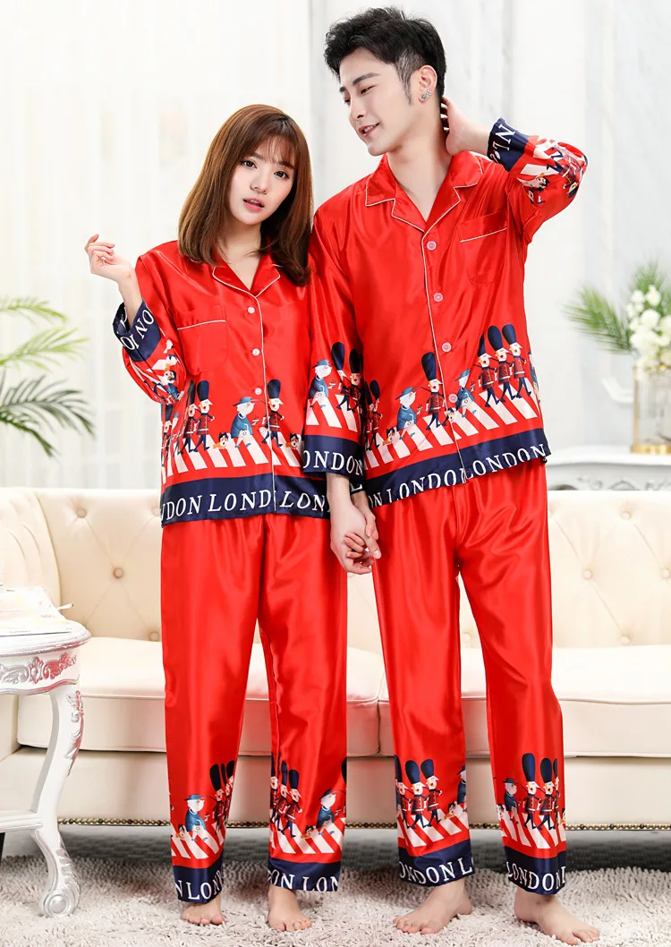 Пижамы для пар, Шелковая пижама с длинными рукавами, набор шелковых...