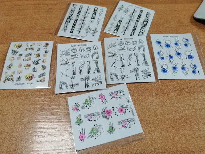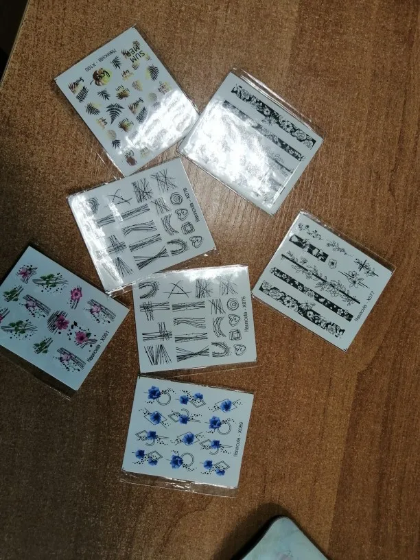 всё хорошо, пришли быстро, наклеивать правда не очень удобно, нужно размочить в воде и после этого приспособиться приклеить на ноготь, несколько наклеек испортила, пока не приспособилась. топ не стоит наносить, пока вода не высохнет