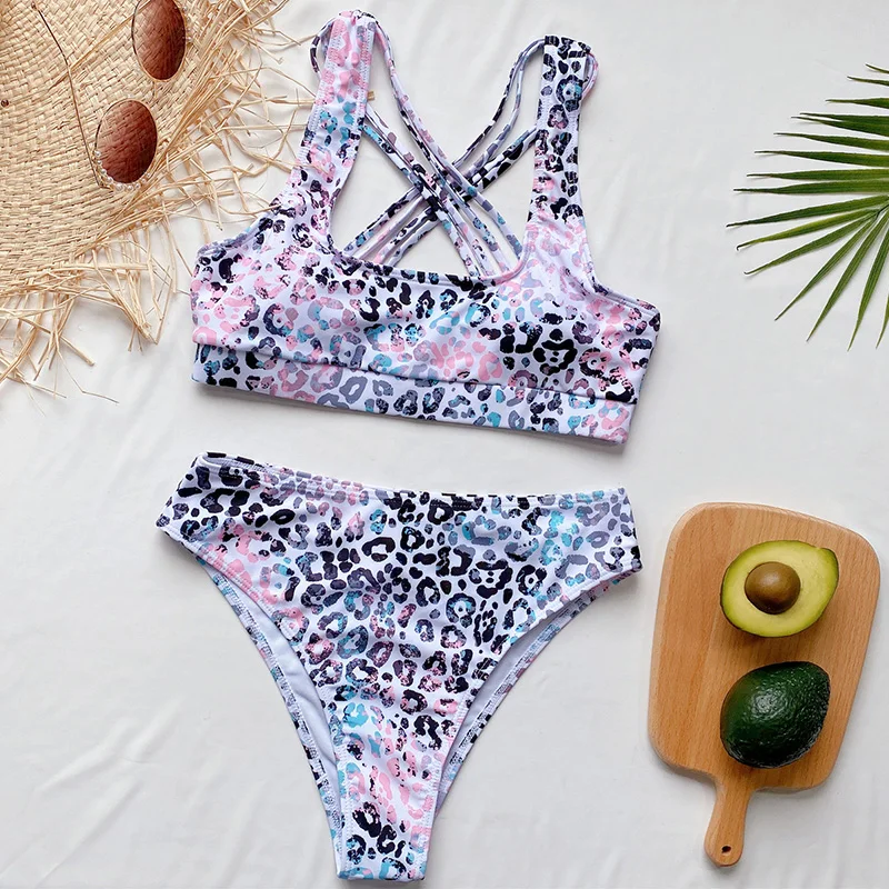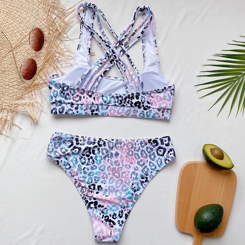 Сексуальный розовый Леопардовый женский купальный костюм с перекрестной спиной, бикини с высокой талией, женская одежда для купания, комплект бикини из двух предметов, купальный костюм с высоким вырезом