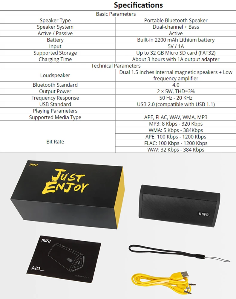 Особенности продуктаВпечатляюще чистый и полный диапазон звукаАвтоматически подключается к последнему подключенному устройствуРазъём подачи внешнего сигнала Aux-в стиле «Джейк и 3,5 мм аудио кабель для наушников не имеющими Блютуз устройствамиВстроенный микрофон для громкой связиПоддержка Micro-SD карты до 32 ГбПоддержка MP3, WMA,WAV, FLAC, APEАвтоматически выключается через 10 минут, если нет ручной работы и не подключено устройствоАккумулятор: встроенный литиевый аккумулятор 2200 мАчВыходная мощность: 10 ВтРазмеры: 6,0 раз 2,6 время 2,5 в/152 раз 66 раз 64 ммВес: 12 унций/341 г (включая встроенный литиевый аккумулятор)