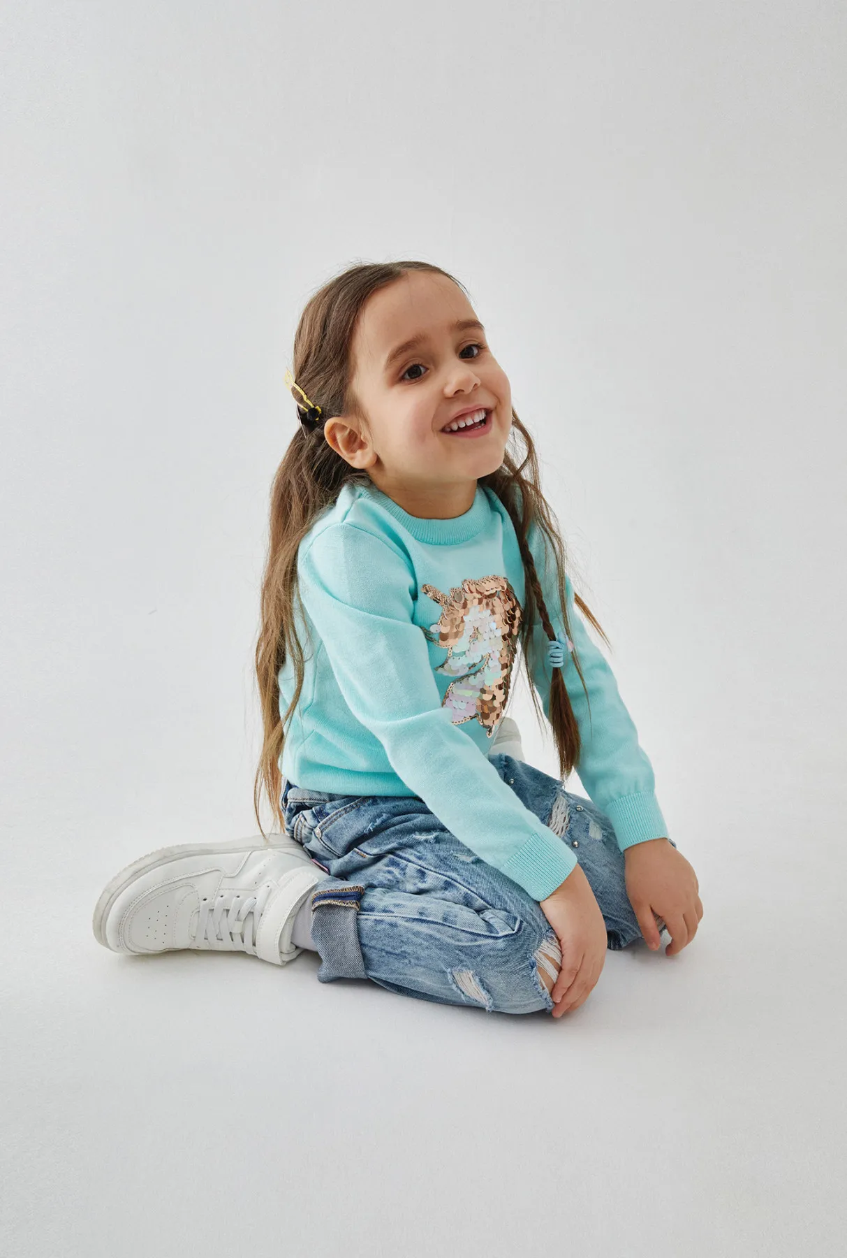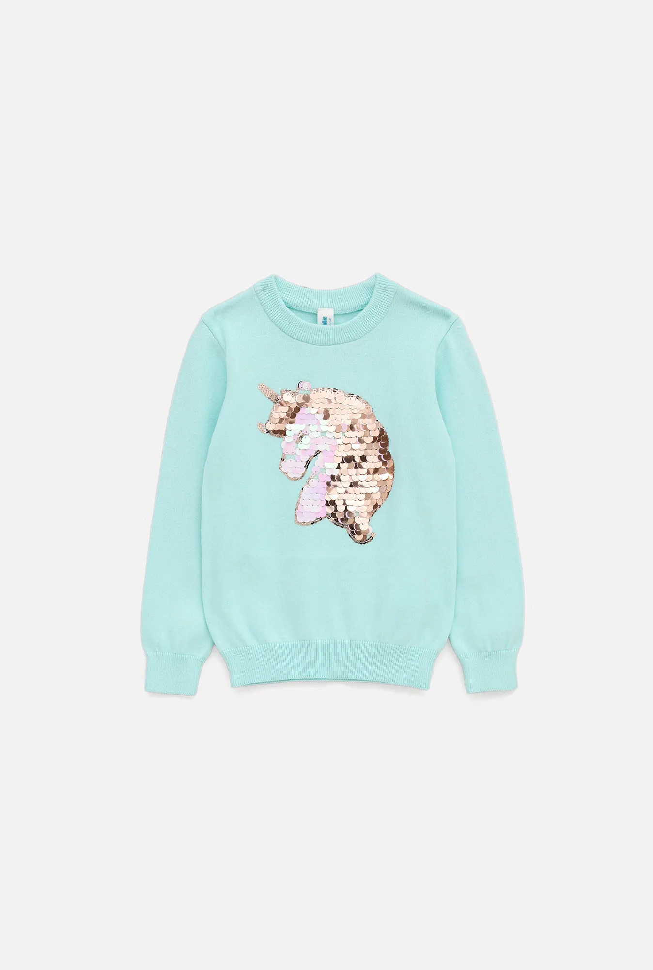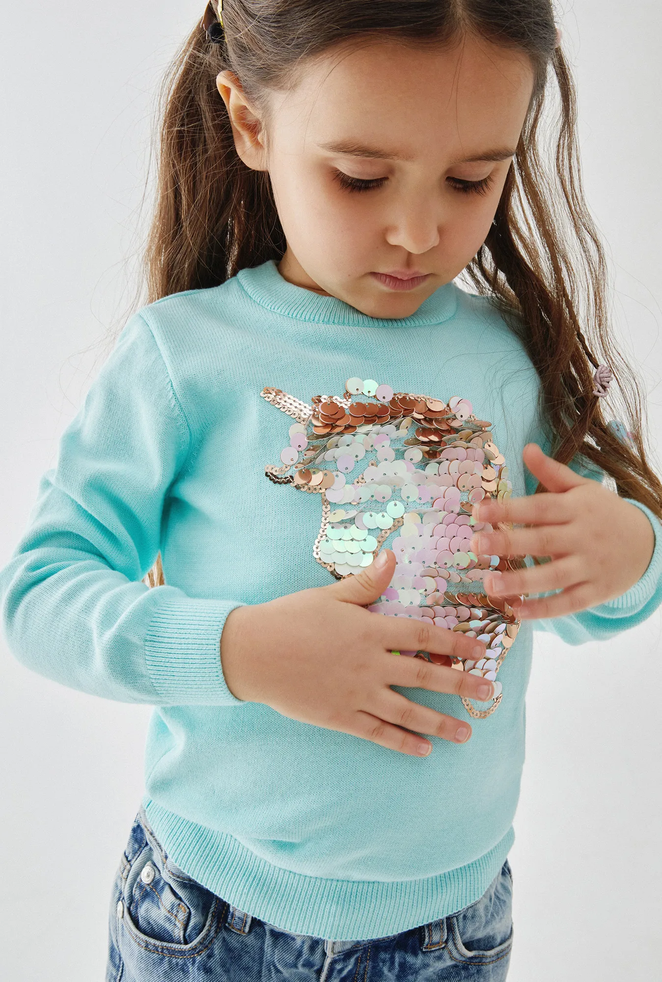 Светло-бирюзовый свитшот с изображением единорога, вышитым пайетками, произведён из натурального, гипоаллергенного, приятного к телу и «дышащего» материала. Рост/размер одежды модели на фото: 110.